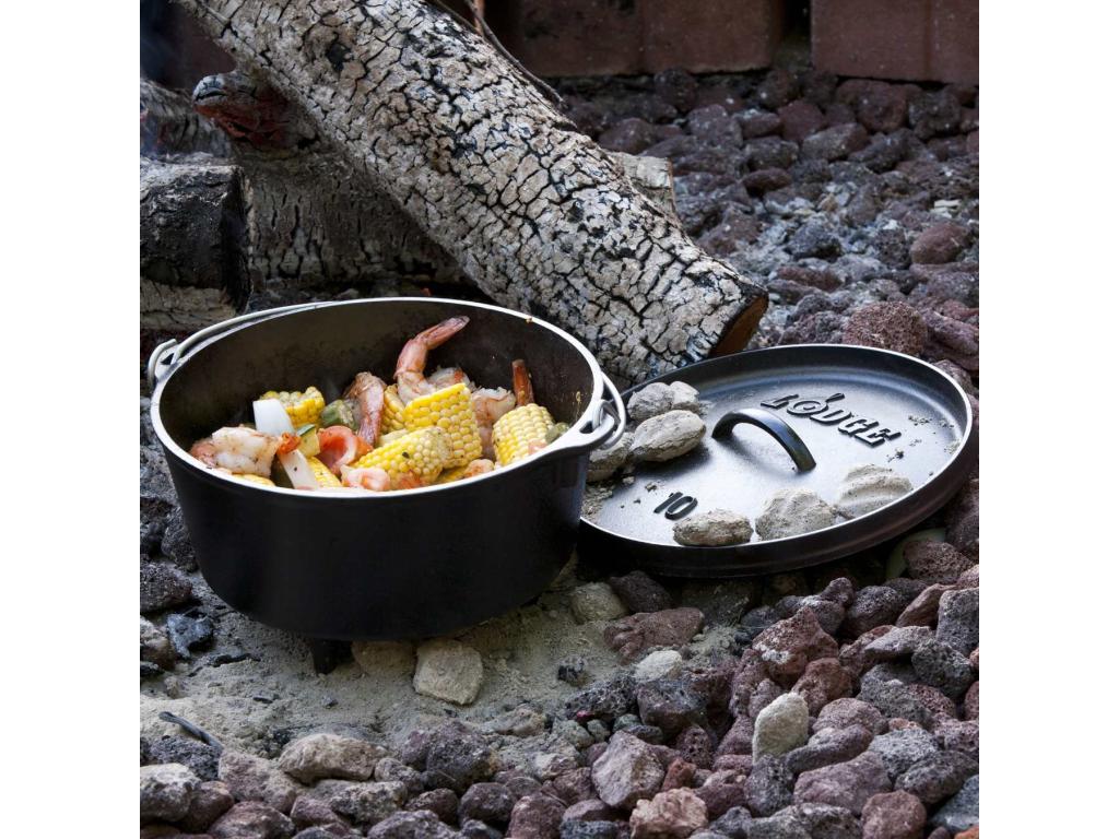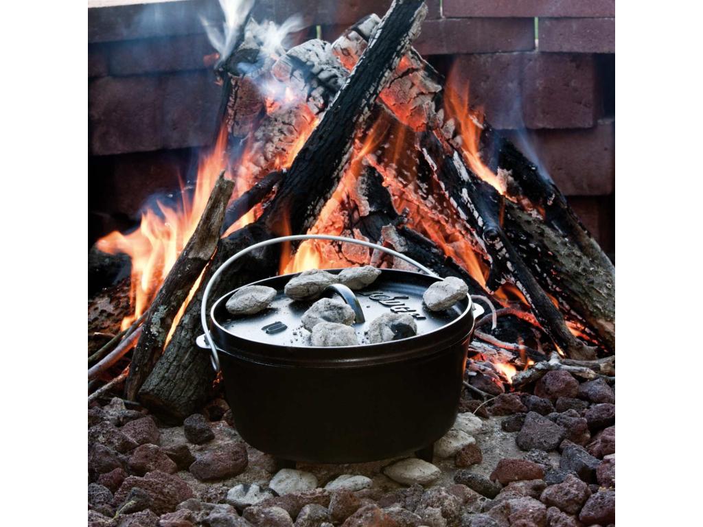 - The cast iron outdoor cooking pot from the brand Lodge with a capacity of 4.7 l is an ideal companion for cooking outdoors, whether over a fire, hot coals or suspended above a flame.