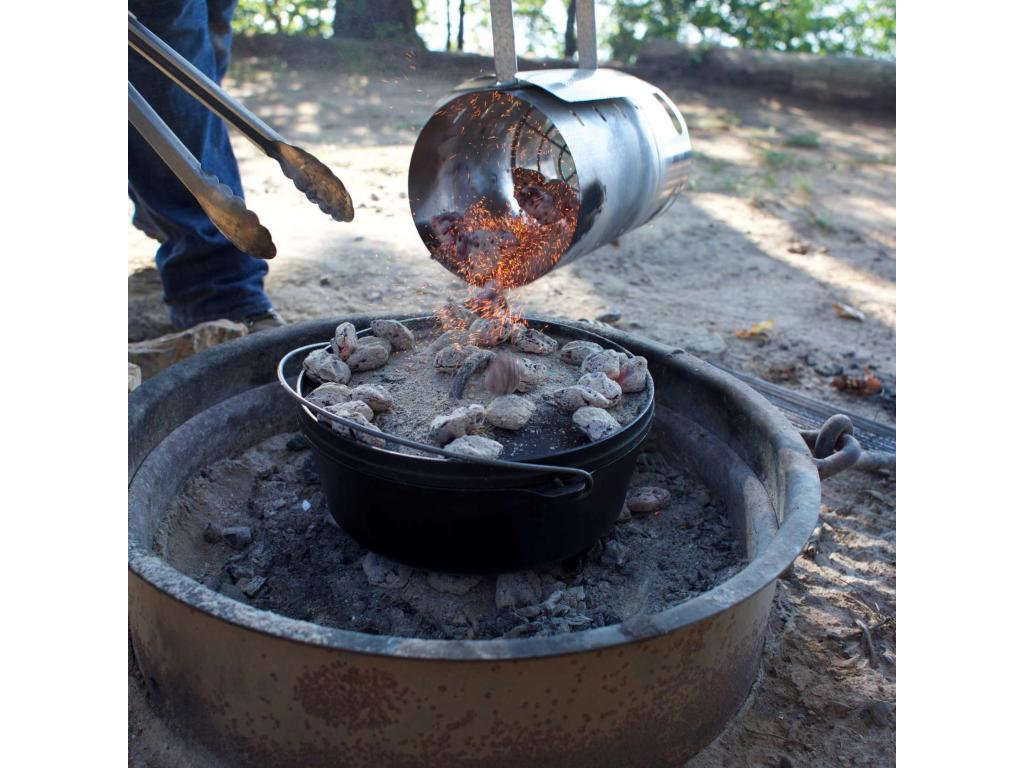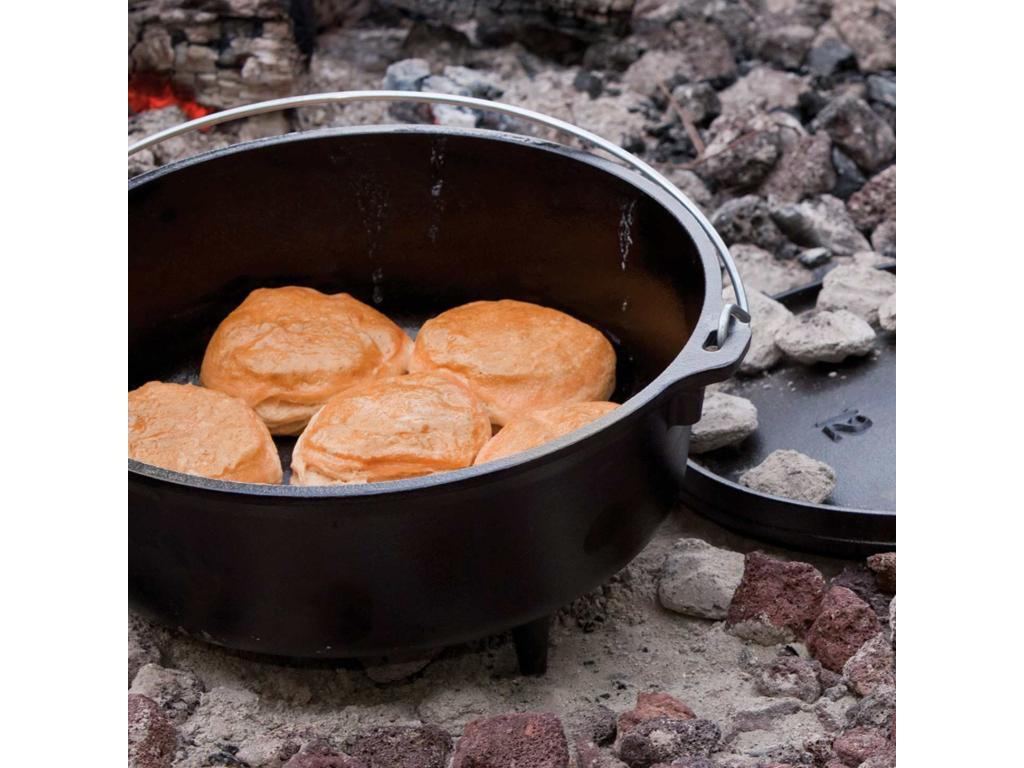 - The flat profile lid with a raised rim allows the hot coals to be positioned from above, creating an even baking environment as in an oven.