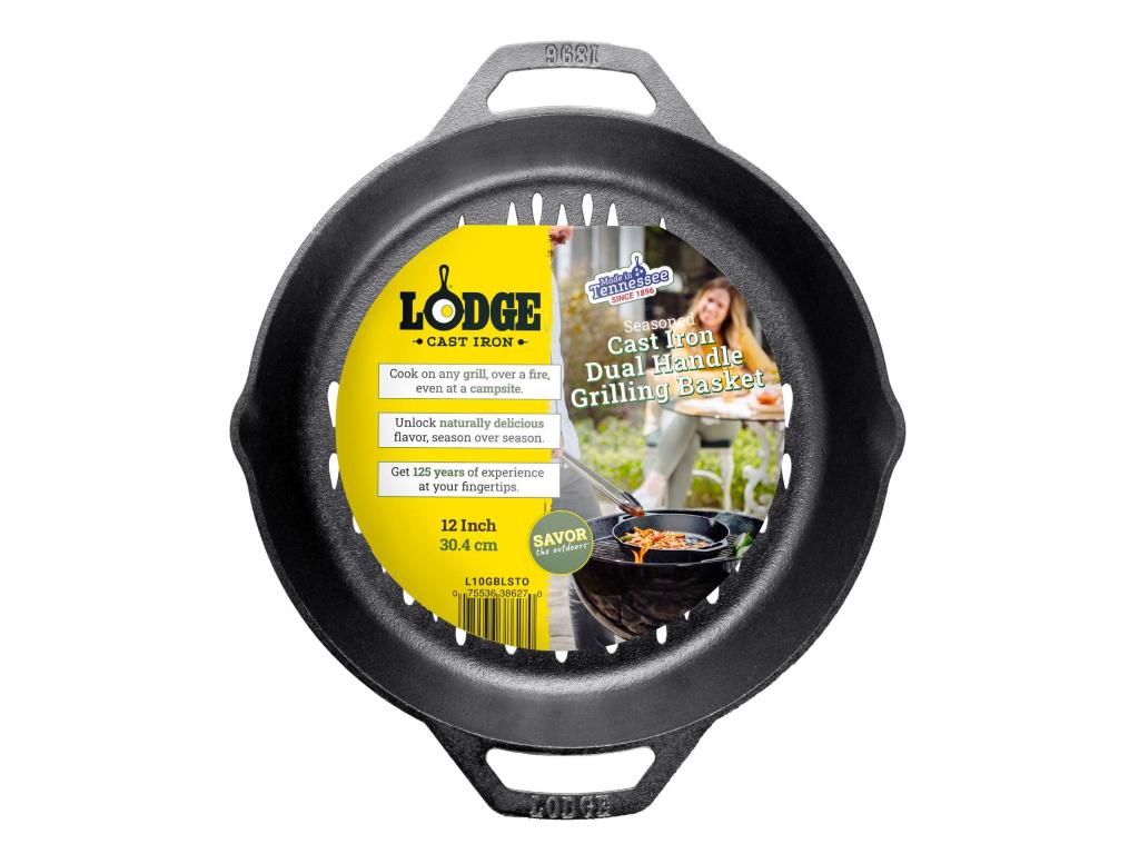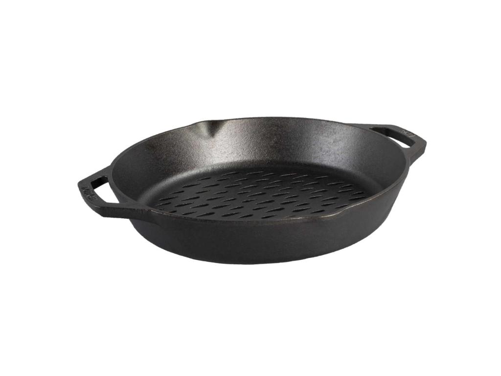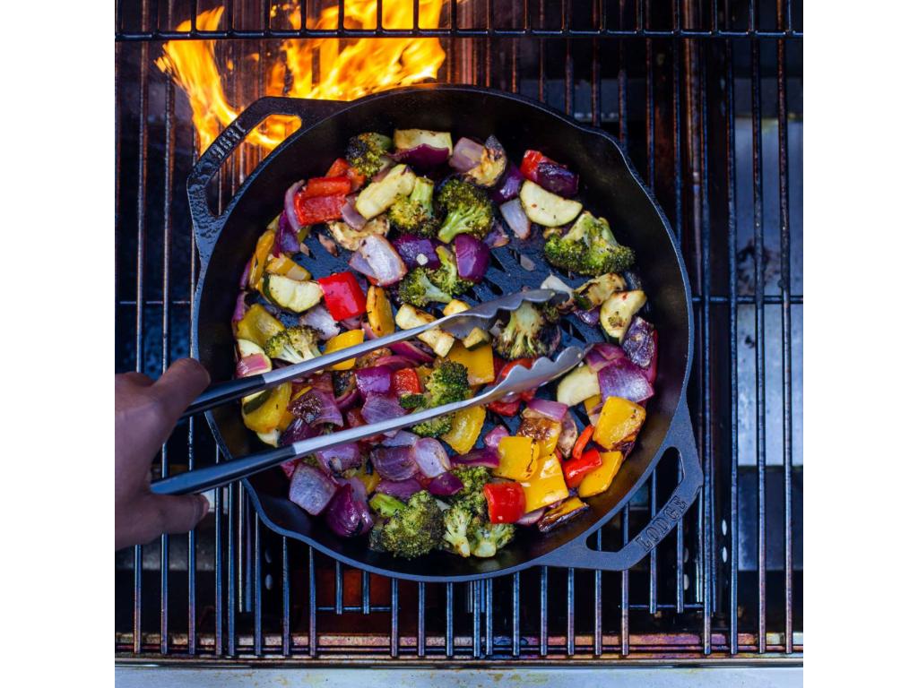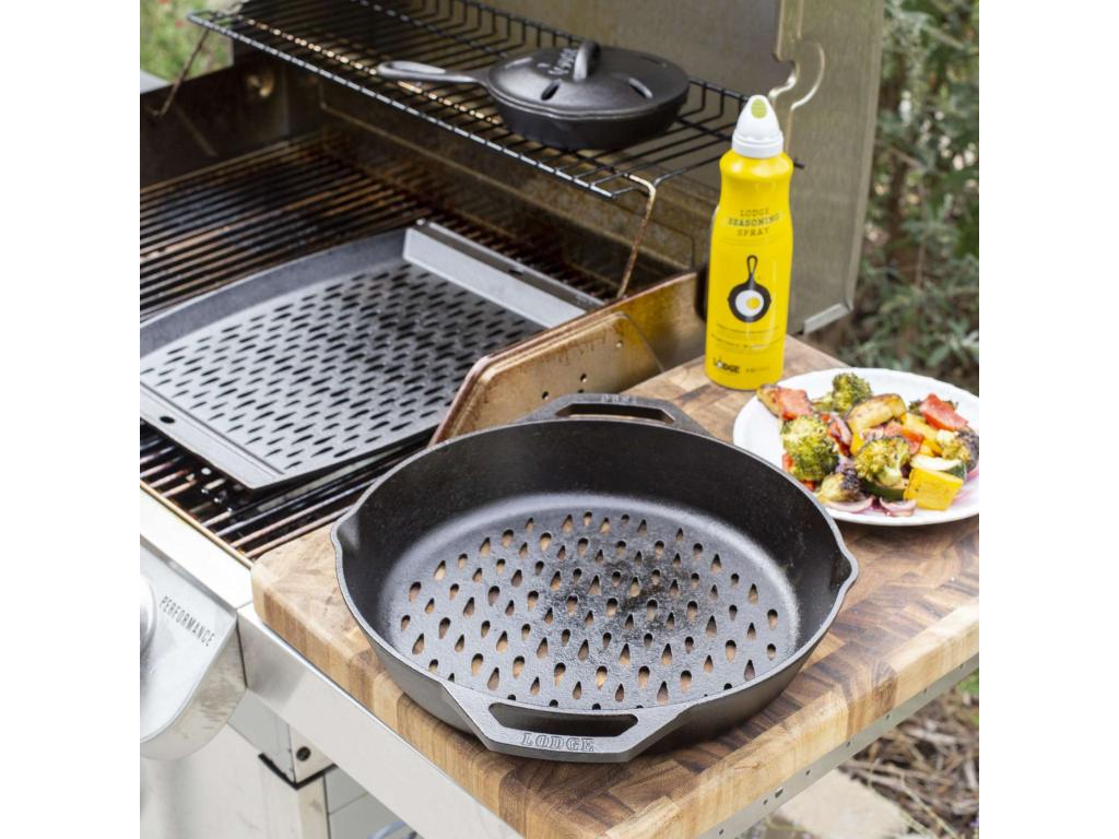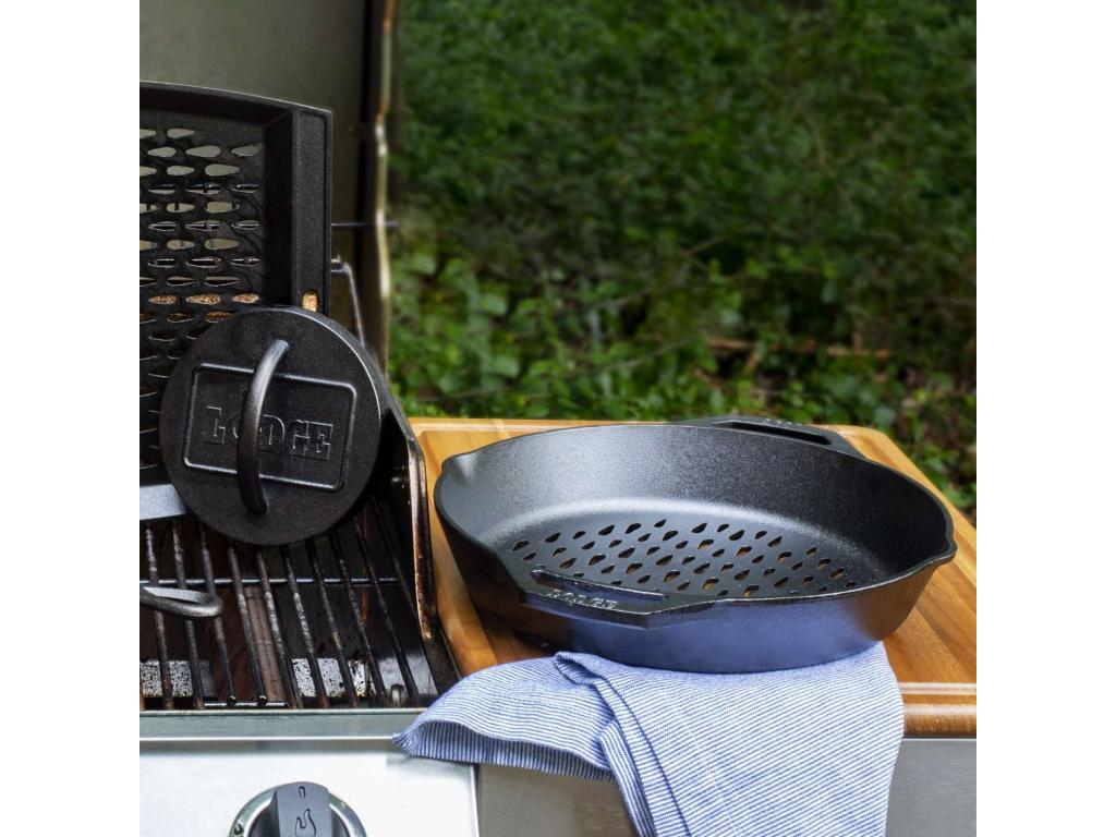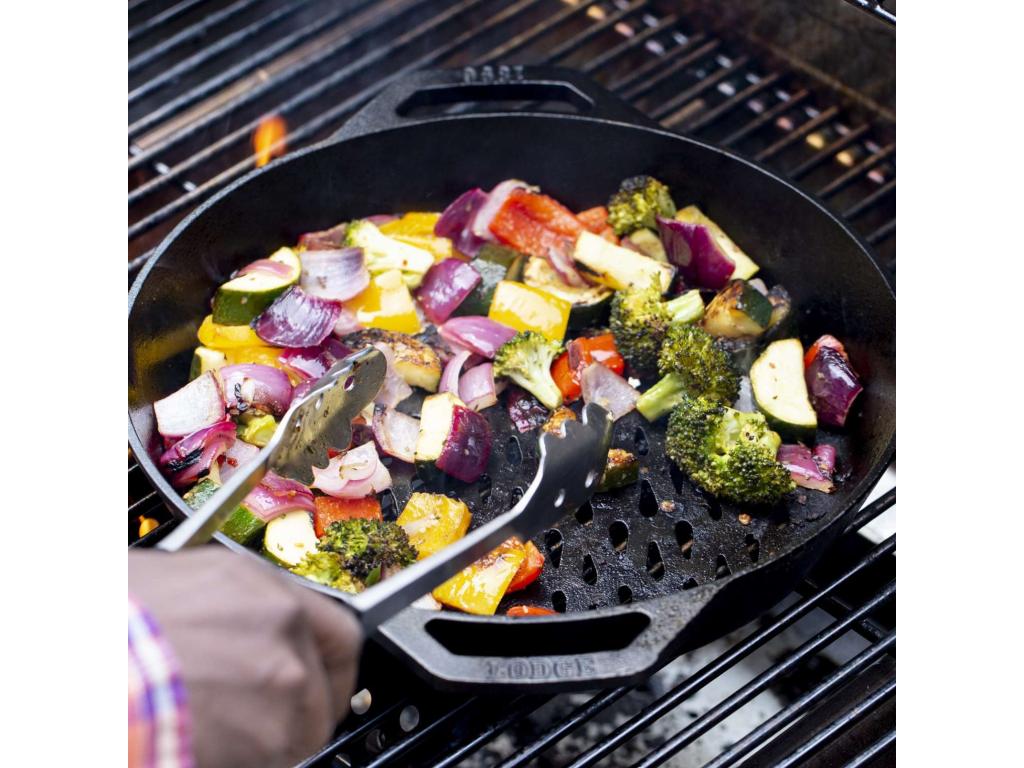 - The cast iron grill pan Lodge is an ideal tool for preparing vegetables, seafood or smaller pieces of meat directly over an open fire or grill.