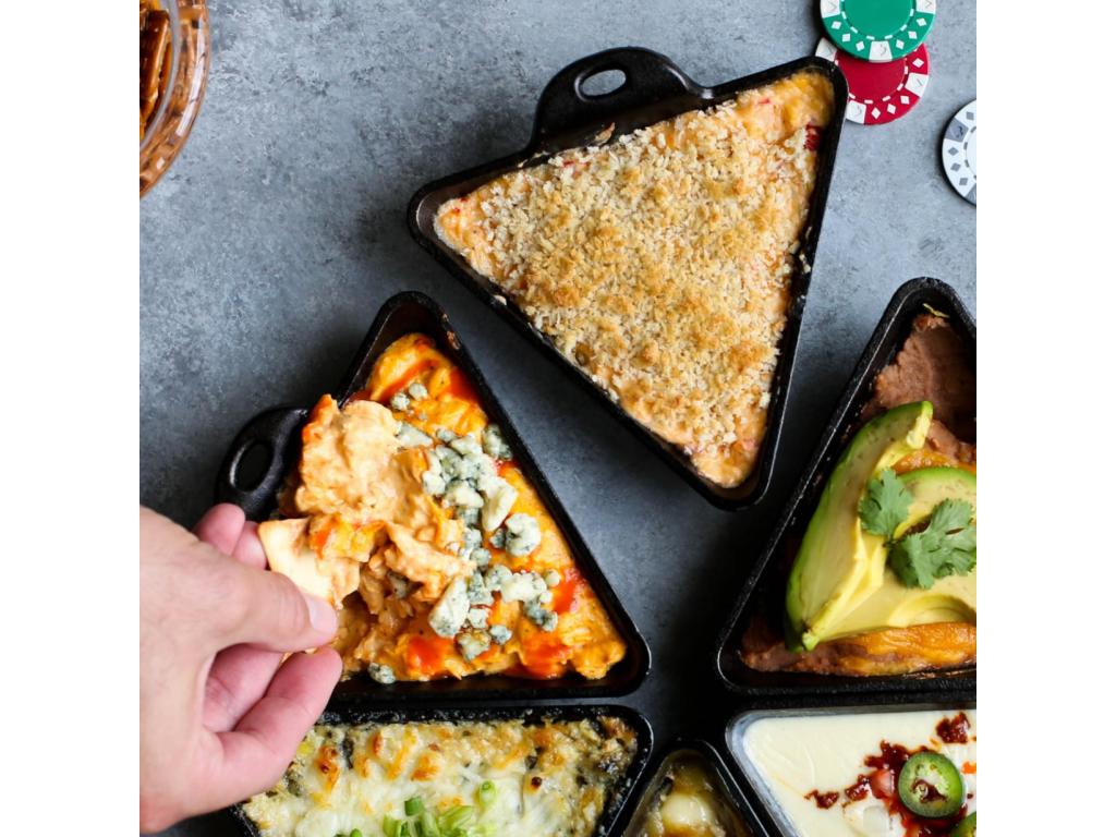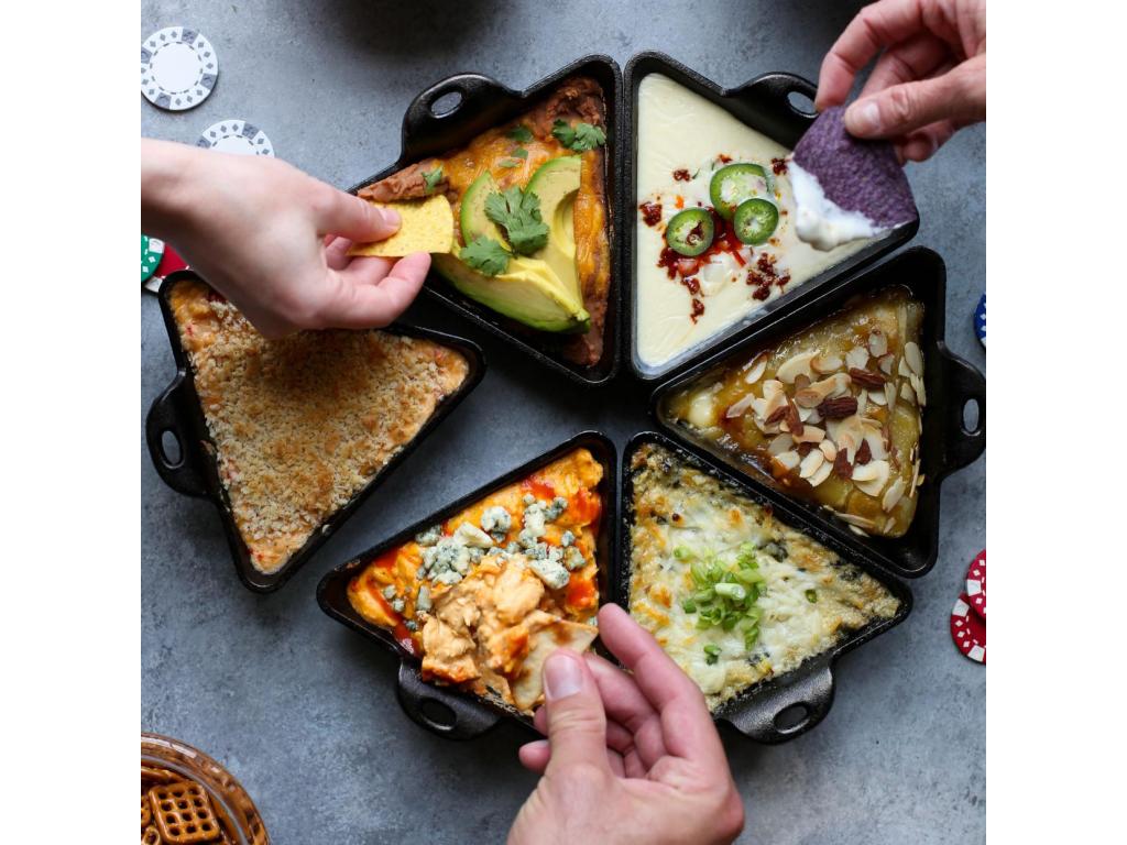 - The cast iron triangular oven dish Lodge is a stylish and practical solution for serving sauces, dips, desserts and small appetizers directly from the kitchen to the table.