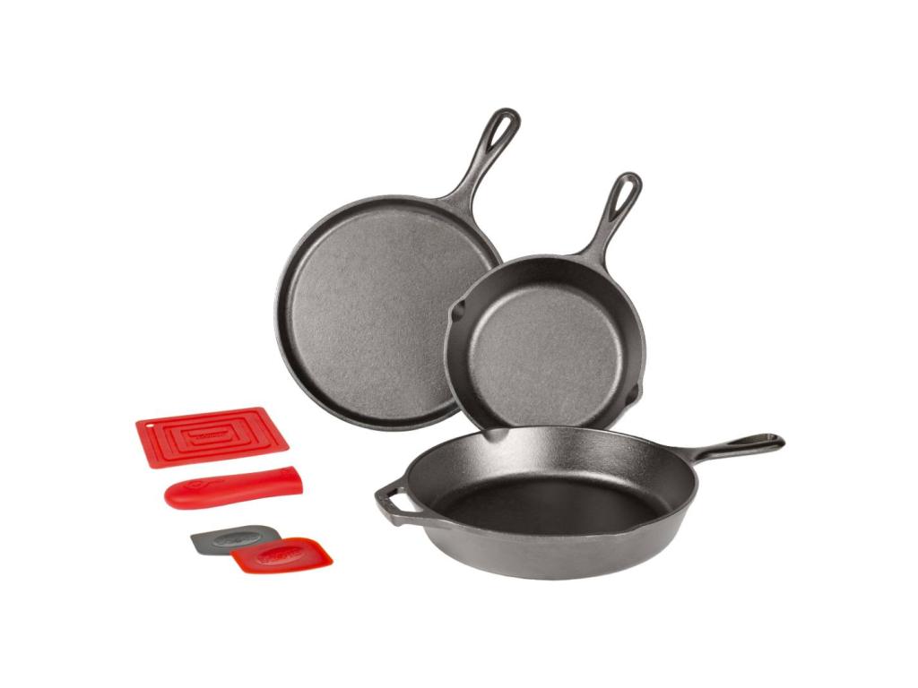 - The cast iron pan set Lodge offers complete equipment for versatile cooking, frying and baking in the home kitchen and outdoors over a fire.