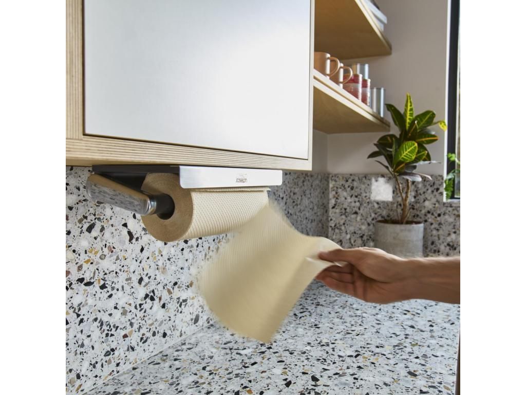 - Thanks to the tensioning mechanism, the paper towel can be easily torn off with one hand, which you will appreciate when working with ingredients or during quick clean-ups.