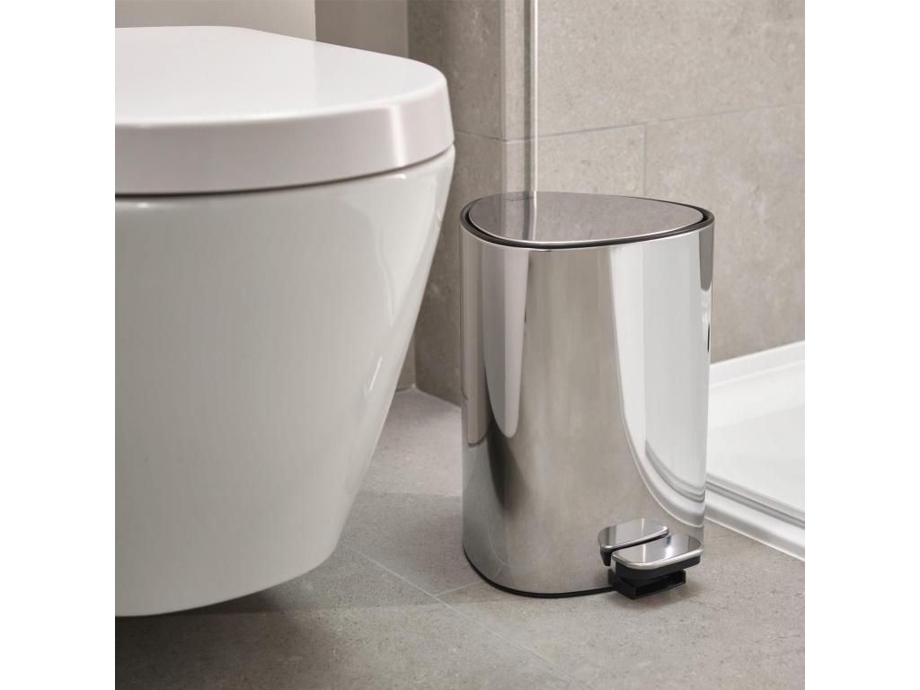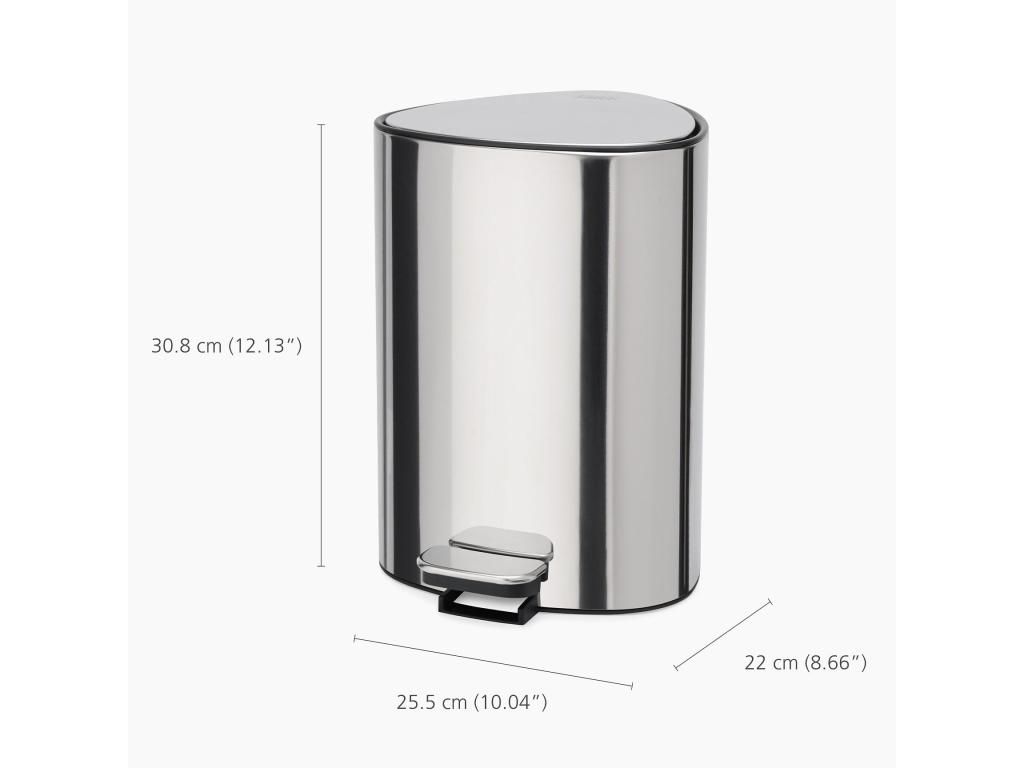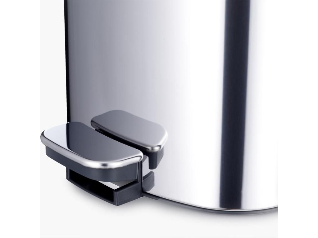 - The Pedal bin EASYSTORE LUXE 5-litre in polished stainless steel is designed to elegantly fit into a room corner and save space.