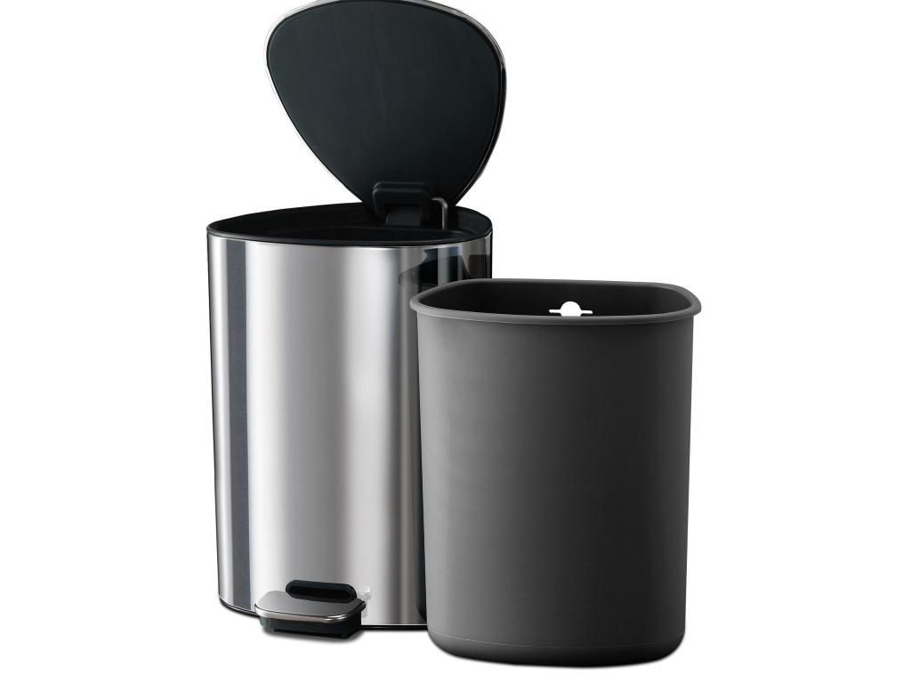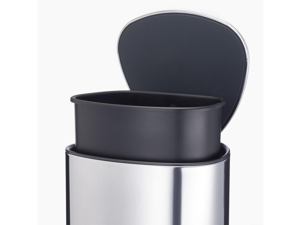 - The bin body is made of durable polished stainless steel and complemented by a stainless steel lid and pedal with a soft-close mechanism.