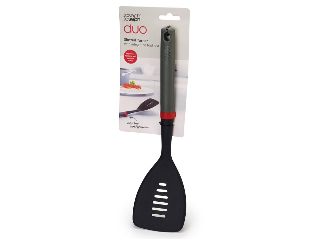 Duo is Joseph Joseph's innovative range of kitchen essentials that brings ingenious solutions to every kitchen. The range is carefully designed with an emphasis on simplicity, innovation, functionality and quality. Each product in this range is made from high quality materials and in a wide range of colours, so you can match them to your interior or other kitchen accessories and utensils. This range includes, for example, a perforated turner with a support to reduce contamination of the work surface.