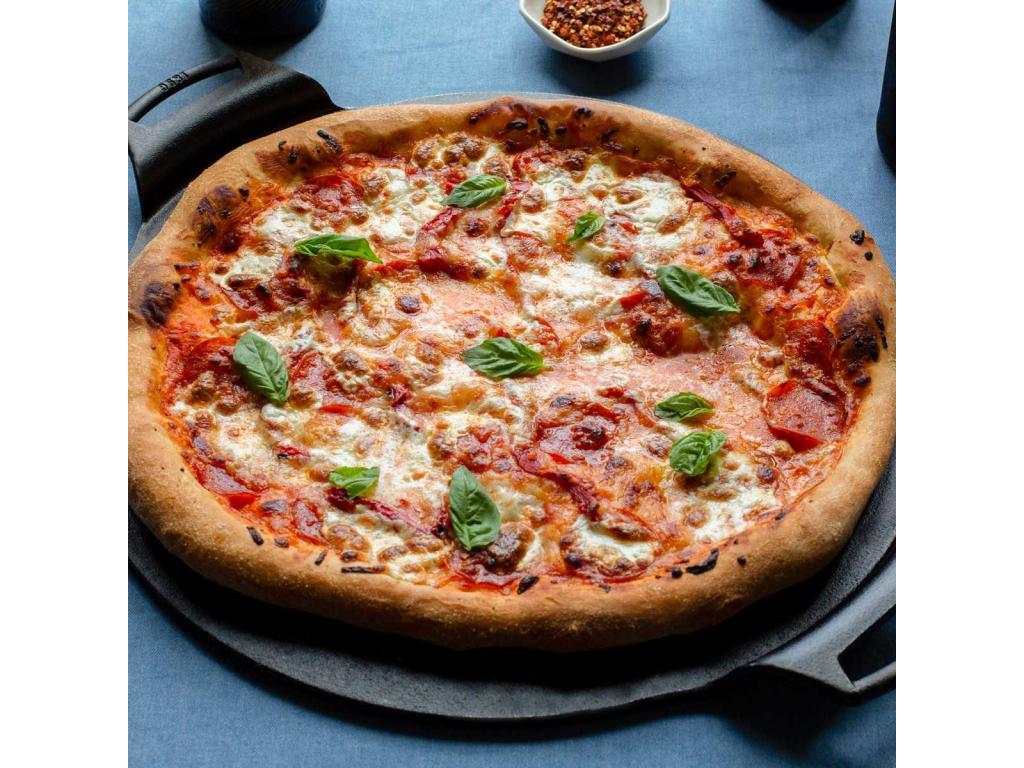- The large surface area allows you to bake even larger pizzas while providing enough space for convenient serving directly on the table.