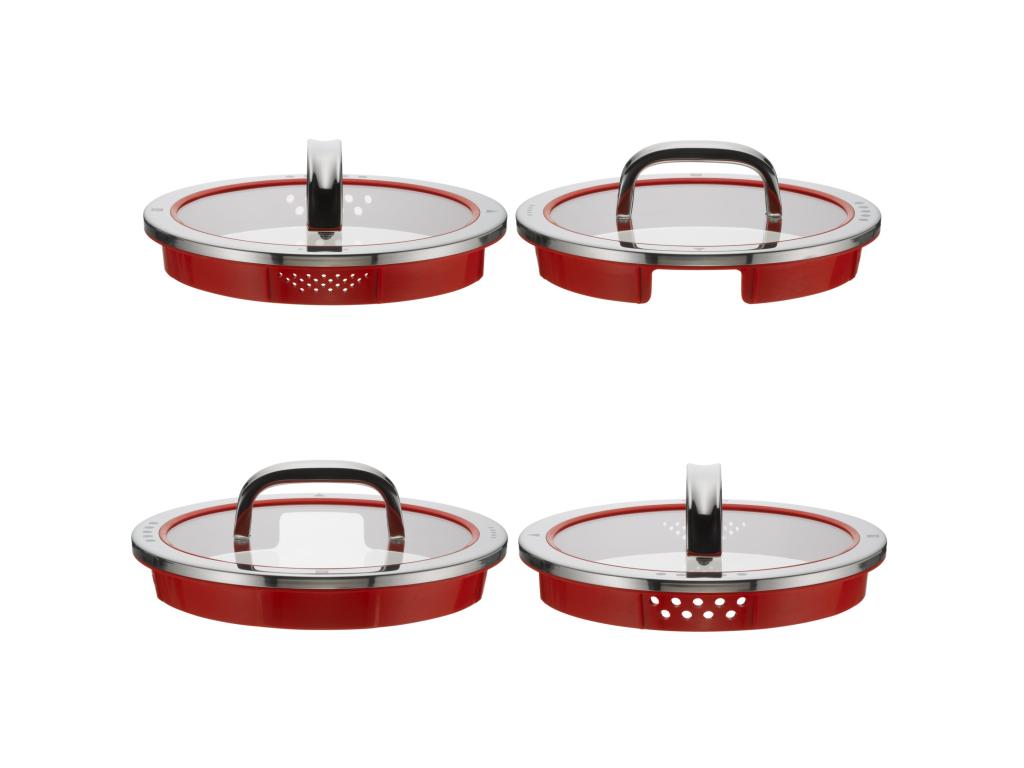 The designers at NOA Design have equipped the Function pots with 4 unique lids. These sturdy glass lids with stainless steel handles have a large enough viewing window for easy inspection of the contents of the pots - plus a silicone ring for shock absorption. They have the added value of a controlled pouring function without the use of a colander, which saves time as well as dishes. The symbols marked on the top of the lid indicate how to position the lid for cooking with small amounts of water, for pouring potatoes, pasta, rice or for quick pouring of the contents.