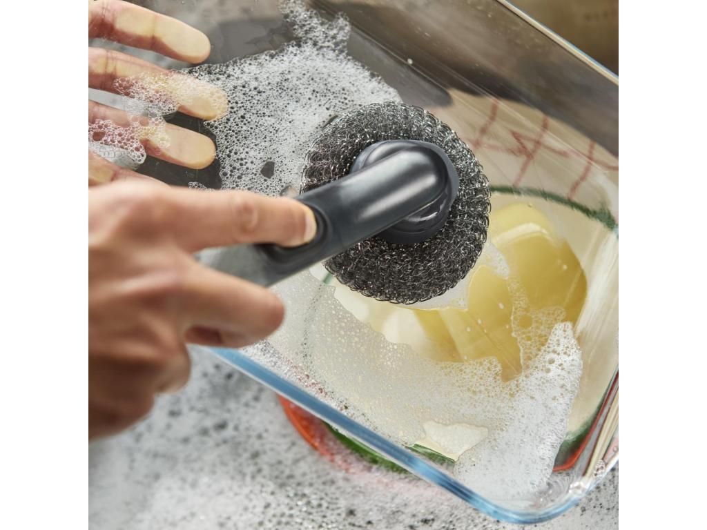 - The wire structure helps to easily remove dried-on dirt from pots, pans, or baking dishes.