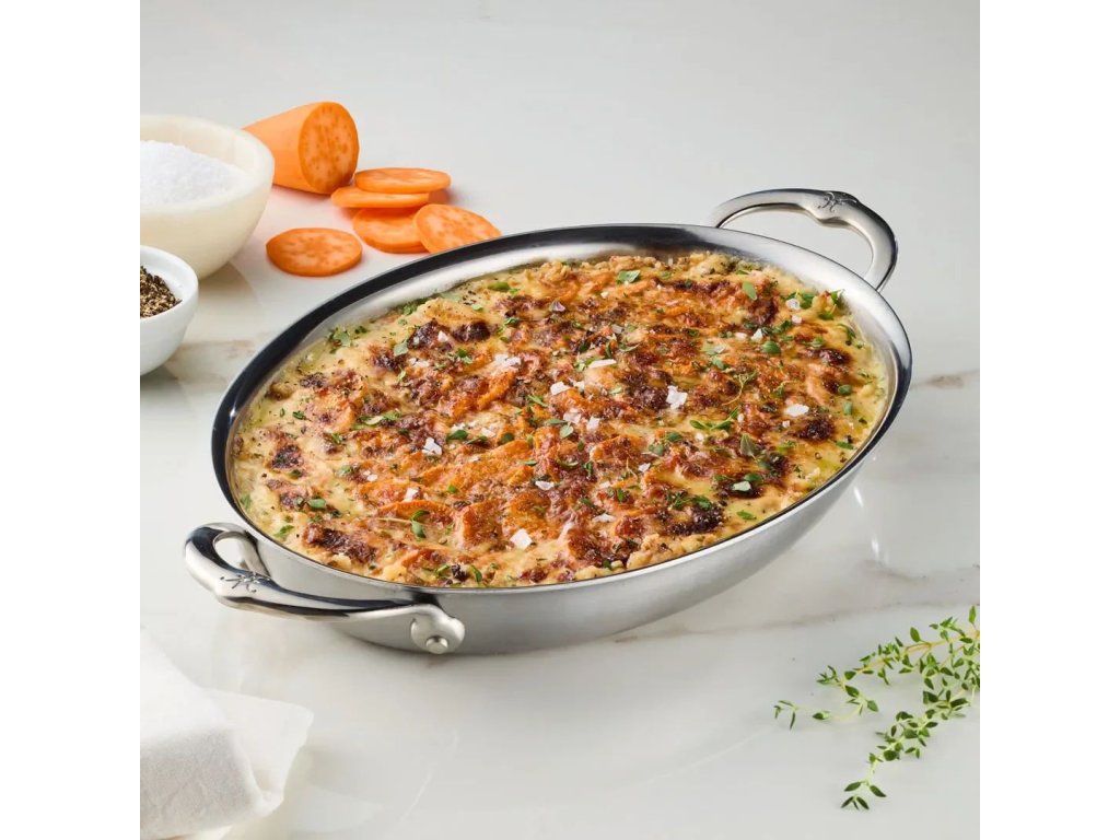 - The elegant oval roasting pan gratin pan Hestan PROVISIONS is the perfect combination of precise craftsmanship, top functionality and timeless design that will elevate every dining experience to the next level.