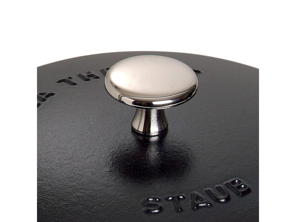 The nickel-plated round handle on the lid of the French brand Staub fits the smaller Staub cookware lids. The handle made of high-quality stainless steel is an indispensable element for comfortable handling, but also a design element of your cookware.
