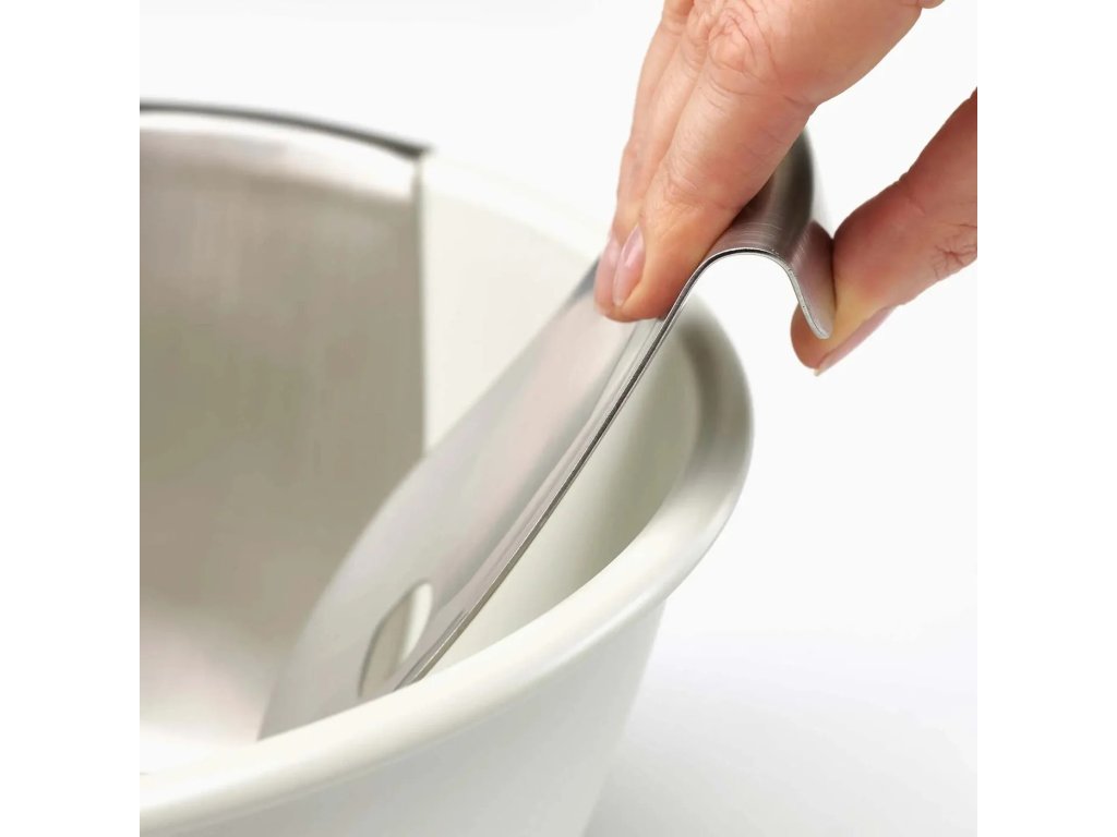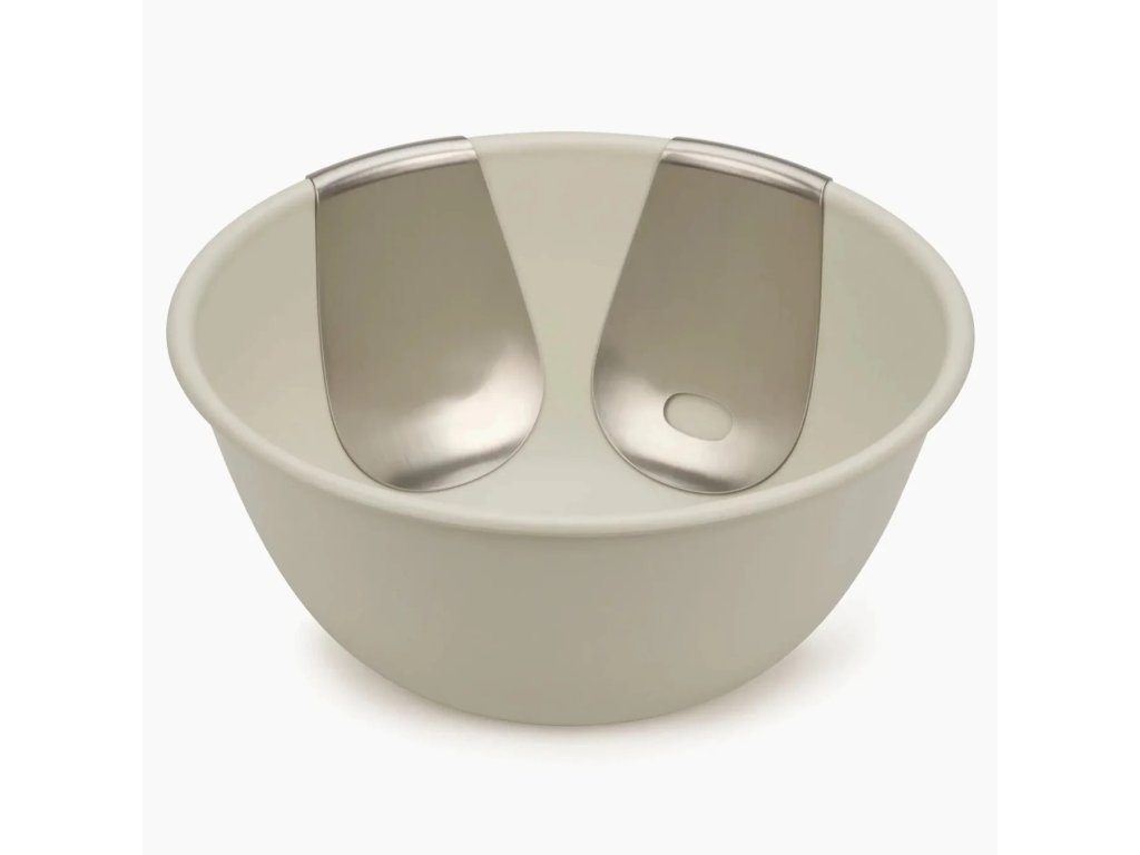 - space-saving stainless steel serving utensils are placed on the edge of the bowl