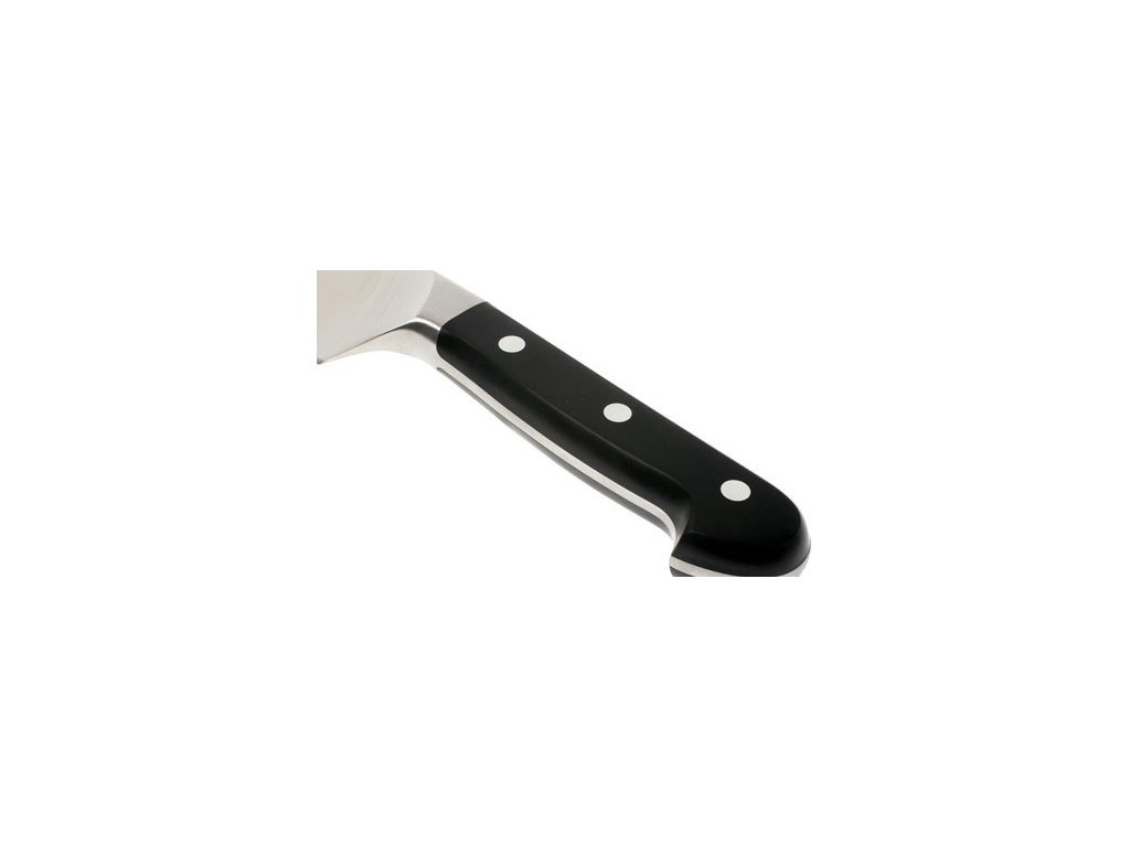 The ergonomic handle is made of a durable synthetic material that is shatterproof, impact-resistant or resistant to food acids. It is dishwasher safe. The handles are attached to the tang by three rivets. The perfect bonding of the individual parts prevents the trapping of deposits and bacteria, so the knives meet strict hygiene standards.