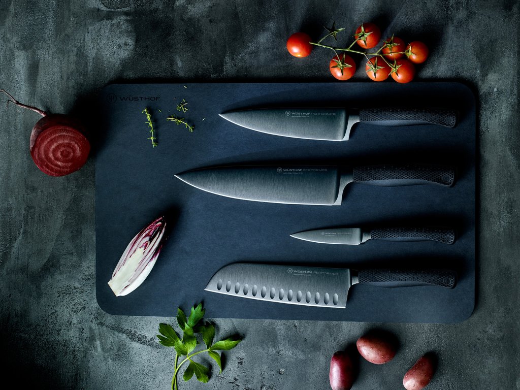 Performer knives slip through food almost frictionlessly: no loss of momentum. Thanks to the particularly low friction and non-stick diamond-like surface and the lotus effect of the black surface, the particles simply slide away on the blade surface. Freshly chopped pieces of food, such as slices of juicy onion, simply slide off: the ideal situation when speed and precision are required in times of intense activity in the kitchen. Thanks to the hydrophobic effect, all liquids flow easily, including acids from citrus fruits as well as fats or starches such as potatoes. Simply wipe the blade after each use and the captivating blade will shine like new.