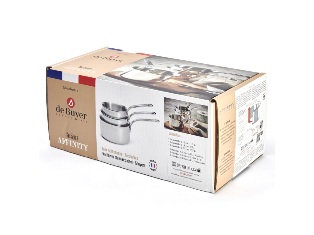 - set of stainless steel saucepans de Buyer AFFINITY includes three pieces with diameters of 16 cm, 18 cm and 20 cm suitable for everyday and professional use