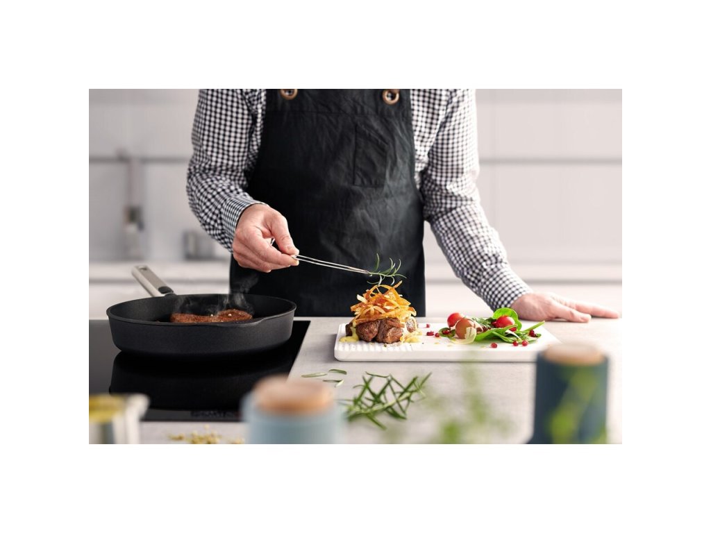 The body of the cookware is made of hardened aluminium alloy, which allows it to quickly accumulate and distribute heat over the entire surface. It is cast in one piece, making it highly resistant to mechanical and thermal damage. It is sturdy and dimensionally stable, suitable for professional and amateur cooks due to its high quality. The very high resistance of the surface allows the use of metal tools.