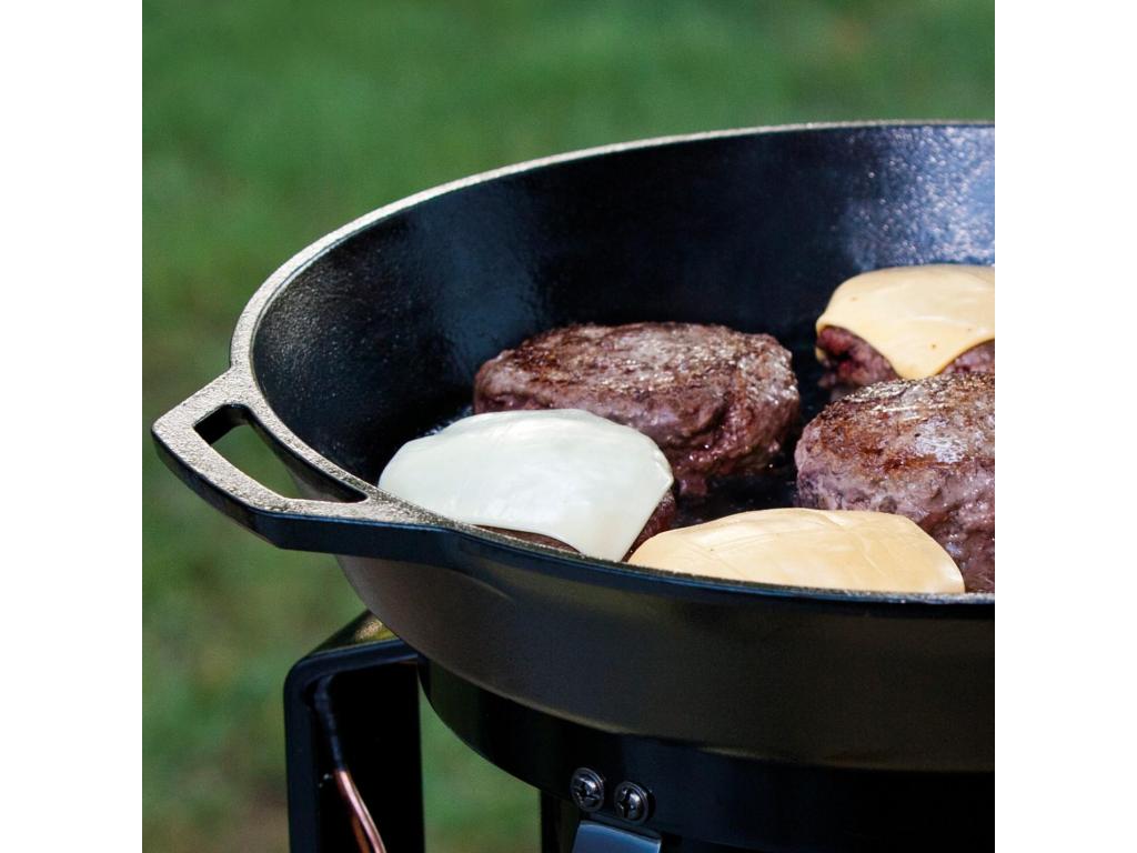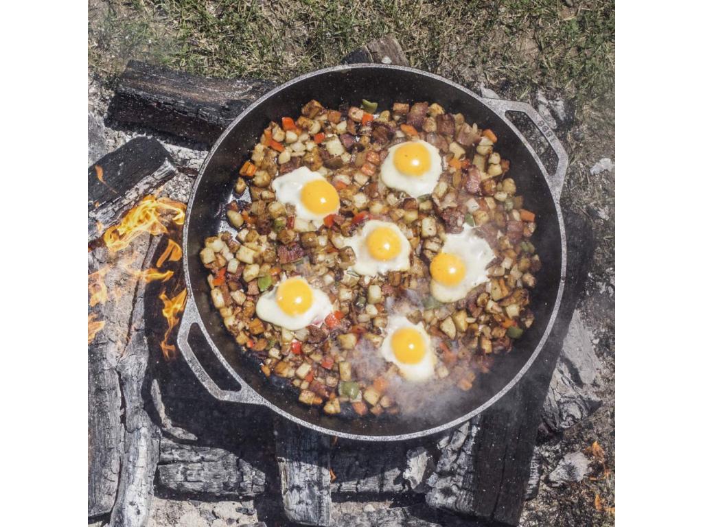 - The cast iron frying pan Lodge with a diameter of 40 cm with two handles is a powerful helper for everyday cooking and serving directly to the table.