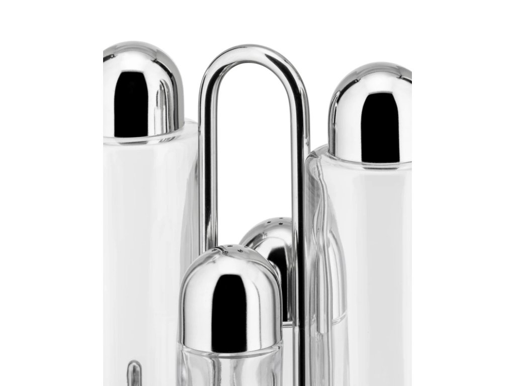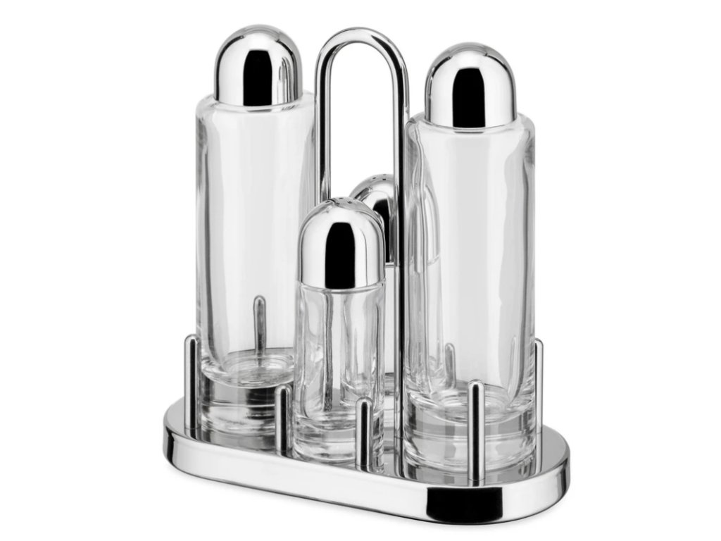 The 5070 condiment set was designed by Ettore Sottsass all the way back in 1978. It consists of four containers for salt, pepper, oil, vinegar, plus a stand. It is considered one of the world design icons and can be found in the collections of many museums as one of the most important projects in the history of design.