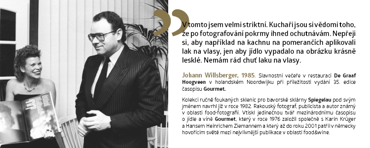 Johann Willsberger is an Austrian photographer, author and journalist known primarily for his "food photography". Among other things, he put a unique face on Gourmet magazine (an international food and wine magazine), which he founded in 1976 together with Karin Krüger and Hans Heinrich Ziemann and which was one of the most influential food & wine publications in the German-speaking world until 2001. Willsberger designed the wine glass collection in 1982.