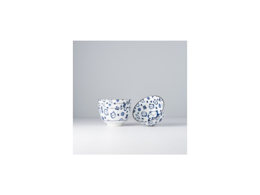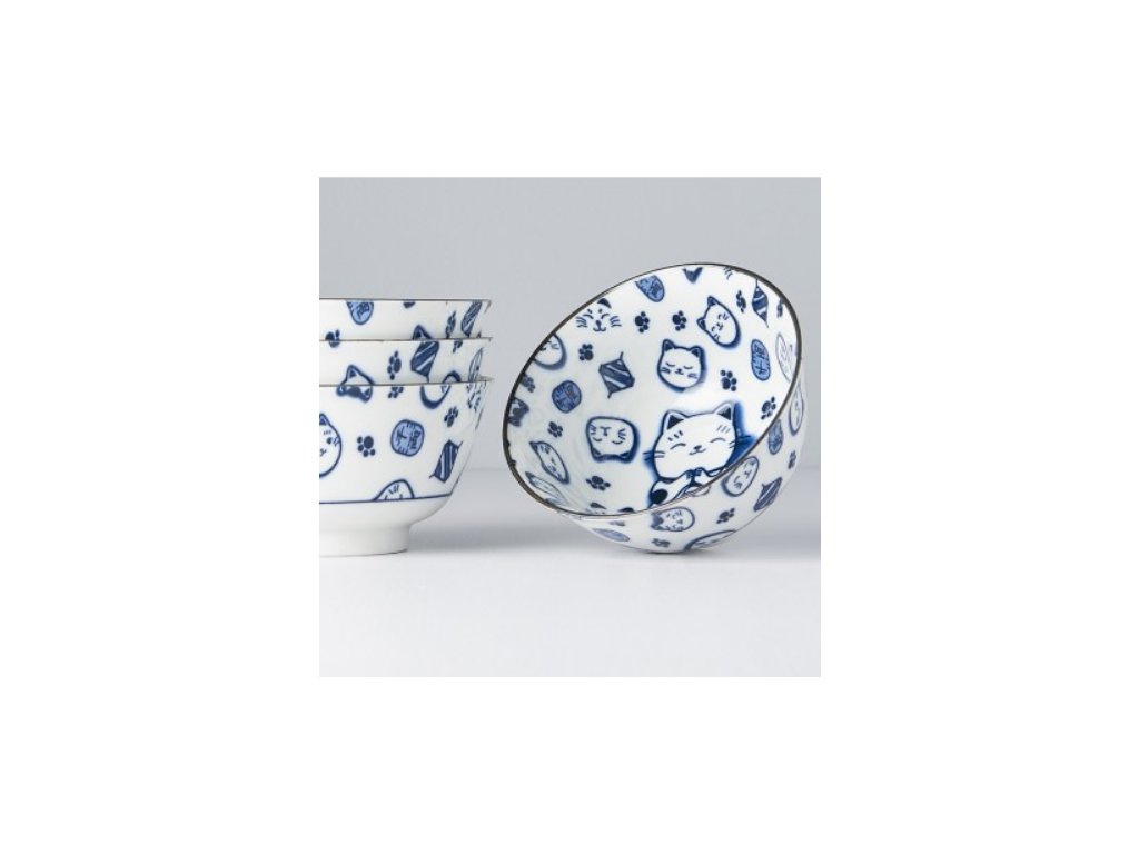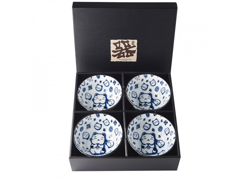 Set contains 4 bowls with blue Japanese cats on white background. The rim of the bowls is bordered in silver. This set comes in an elegant black gift box, and is therefore suitable as a gift for friends or business associates.