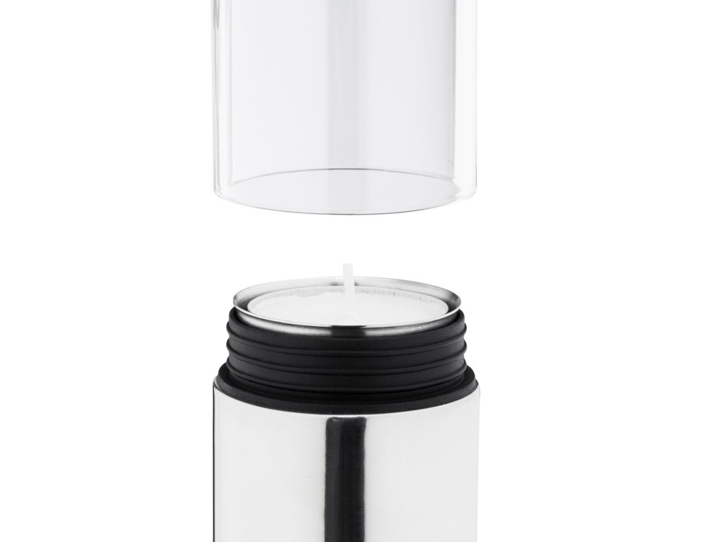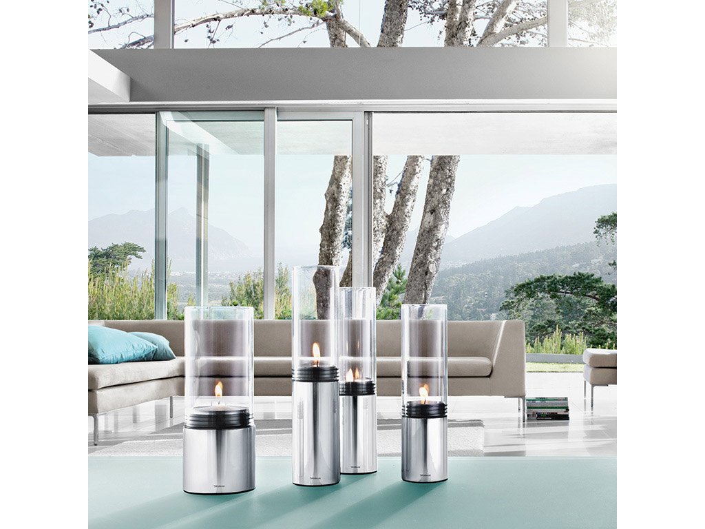 The elegant and beautiful FARO candle holders made of polished stainless steel and clear glass illuminate the evening table with dim lighting and create a romantic atmosphere.