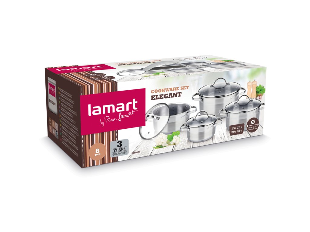 Set of dishes LTSSSET8 from the Elegant series by Lamart contains 4 different sized pots with lids. The pots are made of high quality stainless steel and are fitted with a thick sandwich bottom. This allows the cookware to be used on all types of cookers - gas, electric, ceramic and induction. Stainless steel is hygienic, corrosion-resistant, does not absorb tastes or odours, and is easy to maintain and clean. The dishes can be washed in the dishwasher and used in the oven up to 220 °C.