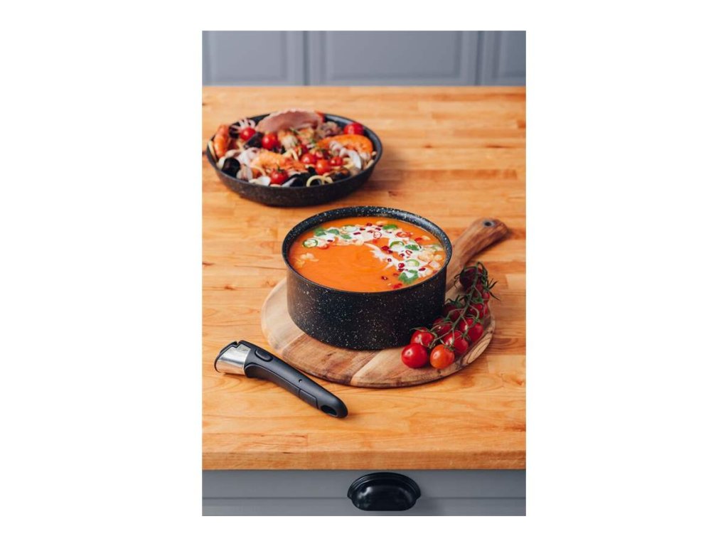 The advantage is the practical safe removable handle with a load capacity of 10 kg, which can be simply clipped onto the cookware and then conveniently removed for use with the next cookware. Thanks to the 100% safe, durable non-stick surface Titanium Mineralia+, the pans are scratch-resistant and easy to clean. The handy Thermo-Spot® always alerts you by colour when the pan has reached the ideal temperature. The cookware is dishwasher safe and can be used on all types of hotplates including induction.
