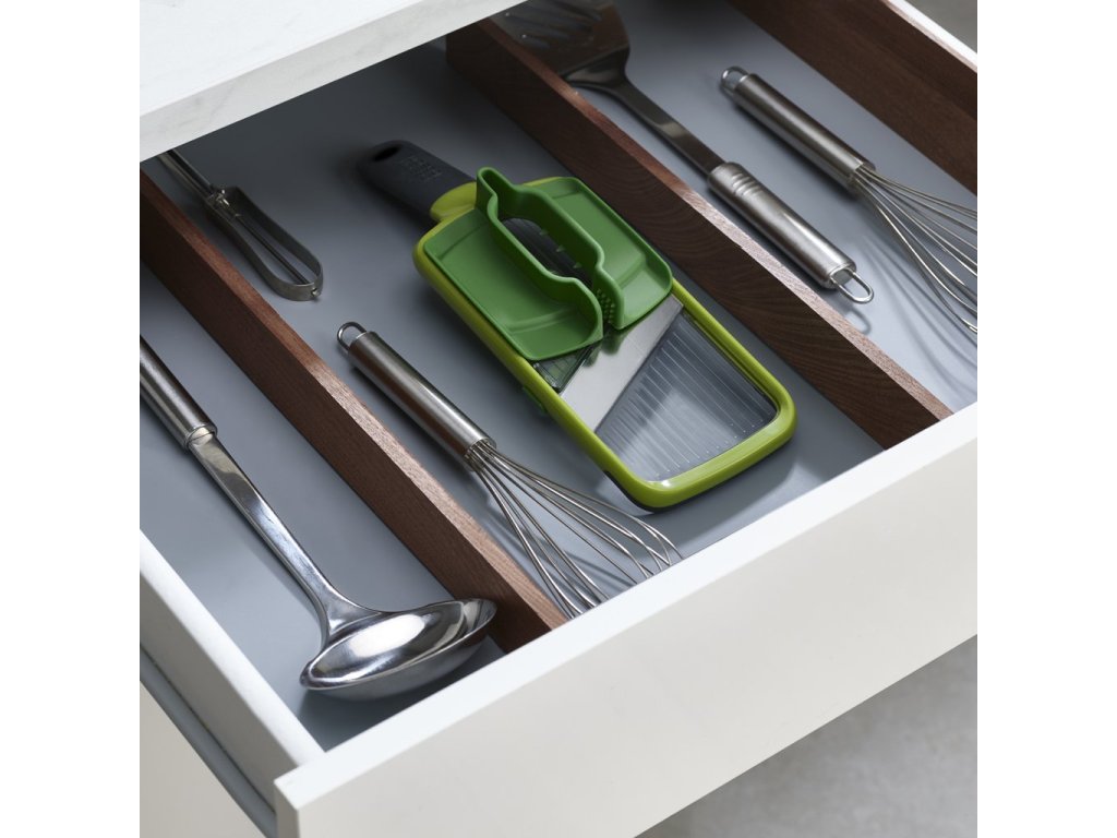 Set of JOSEPH JOSEPH Multi-Grip Mandoline slicing grater and Multi-Grate compact double grater. The vegetable slicer with innovative slicing holder has a precise shape that ensures safe slicing of small and large pieces. Use the smallest tongs when slicing radishes or garlic. The medium holder is suitable for slicing carrots and cucumbers. With the flat holder, you then create long slices of courgettes and aubergines. Three slice thicknesses can be set. The compact double grater has a coarse side for cheese and vegetables and a fine side for grating hard cheese (parmesan) and citrus peel. The paddle-shaped design makes it easy to grate directly over the plate.