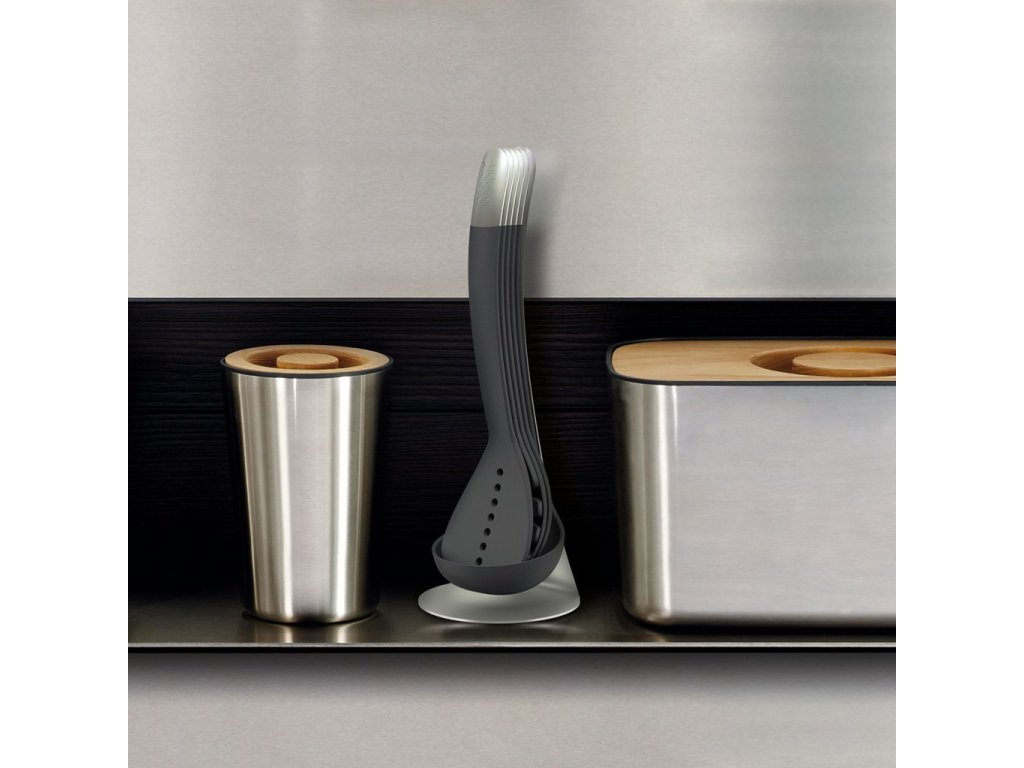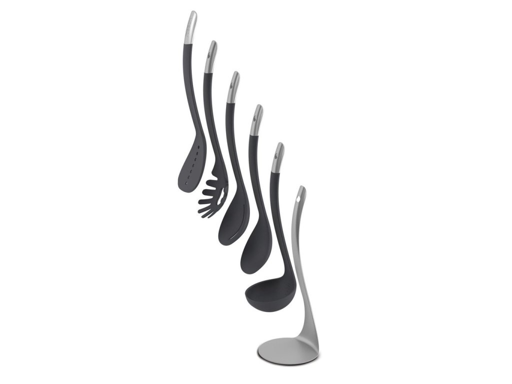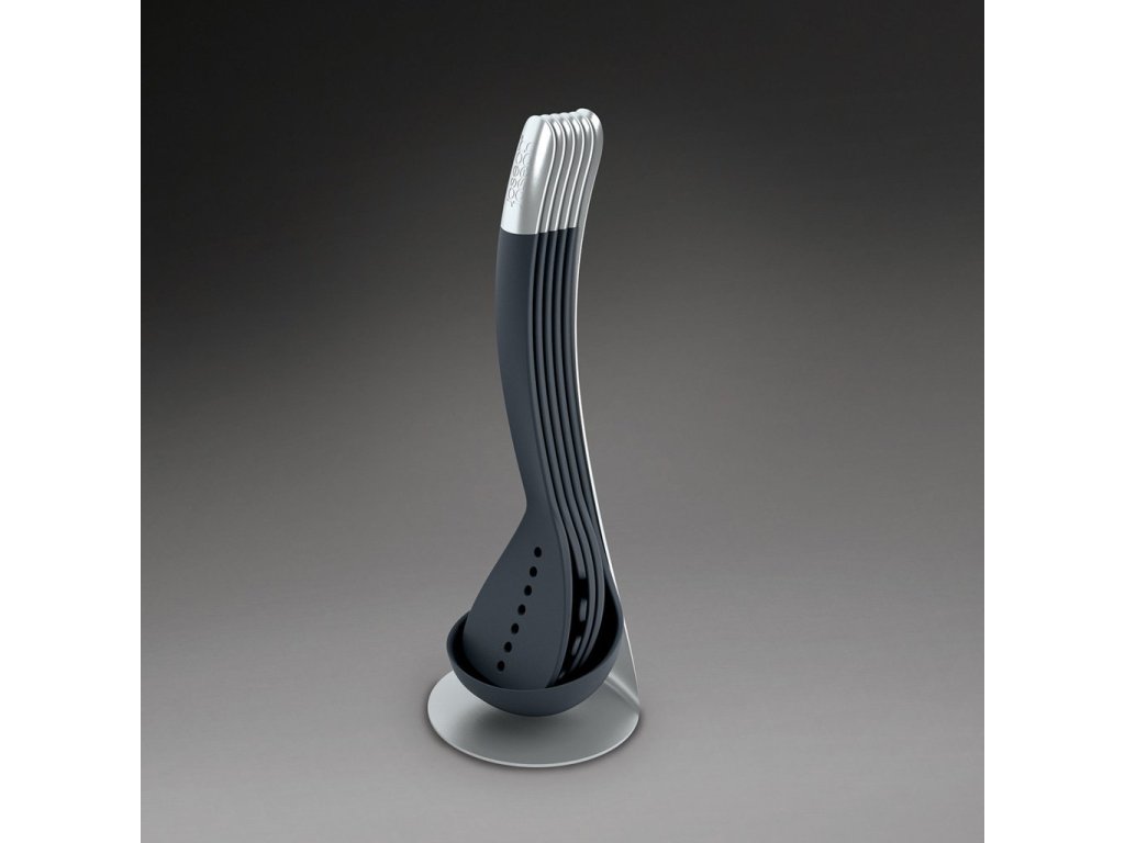 Compact set of JOSEPH JOSEPH Nest 100 Utensils with magnetic handles. Set includes perforated turner, spaghetti tool, perforated spoon, spoon and ladle. The innovative Nest 100 Utensils model comes with a separate stand on which you can place tools that are not currently in use. The tools are temperature resistant up to 200 °C and dishwasher safe. Nest Utensils was awarded the Red Dot Award Winner 2012.