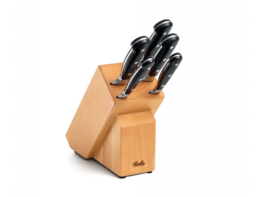 The Alaska knife set in block from Fissler offers stable kitchen essentials. The knife blades are made of stainless, corrosion-resistant premium steel with precision grinding and always allow easy cutting. The handles in the classic three-rivet design are equipped with an integrated hand guard to ensure a secure grip when cutting. The block is made of solid wood, which gives the blades ideal protection.