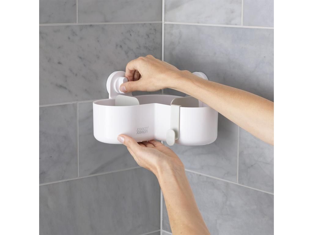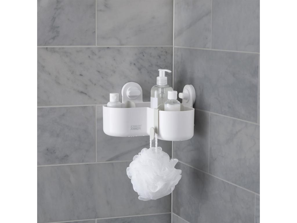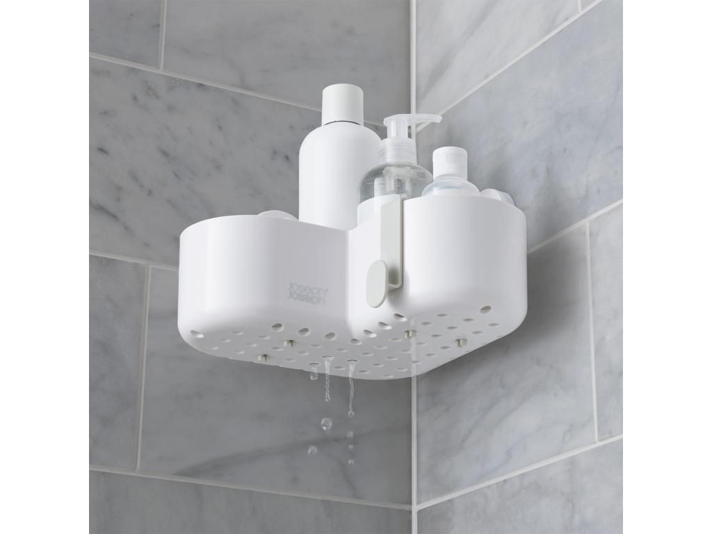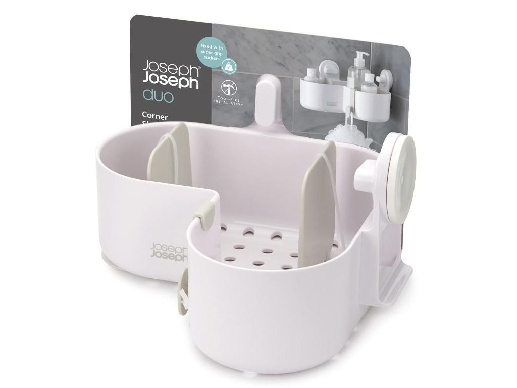 - The Joseph Joseph DUO corner shower shelf provides a practical and clear solution for storing soap, shampoo, and shower gel directly in the shower cubicle space.