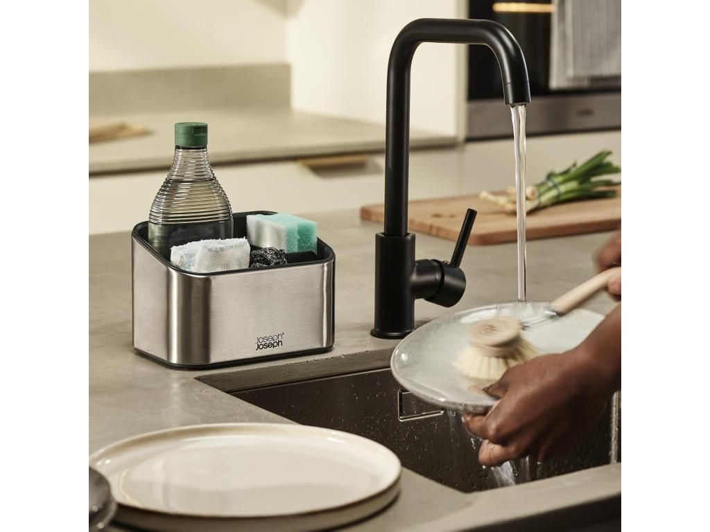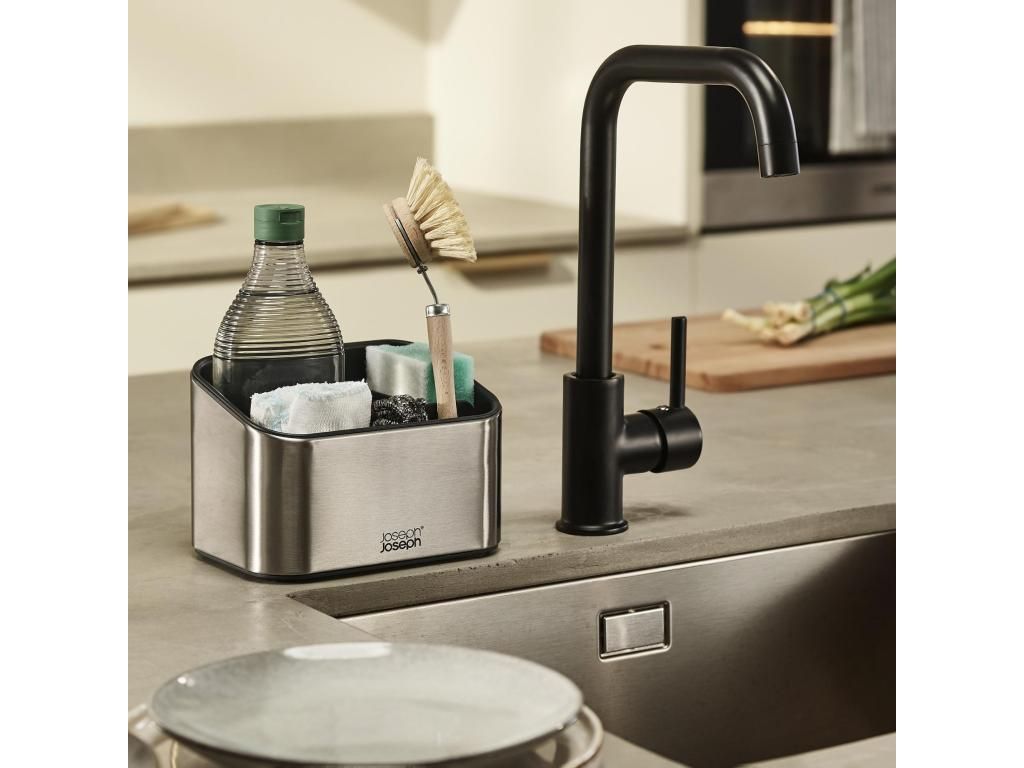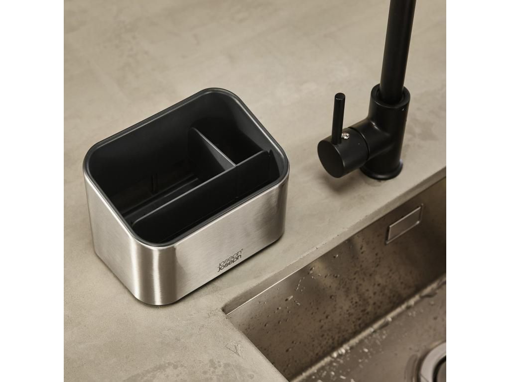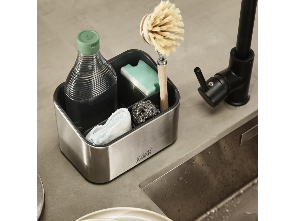 - The SURFACE Sink caddy in a stainless steel finish offers an elegant and well-thought-out solution for organizing washing supplies right by the kitchen sink.