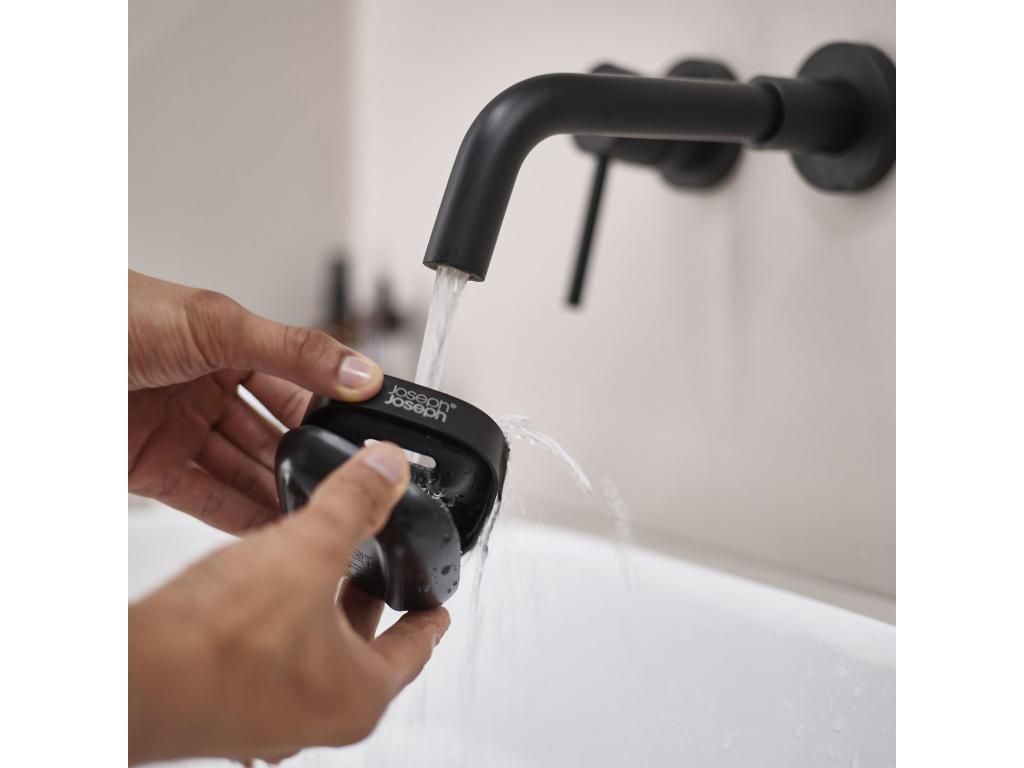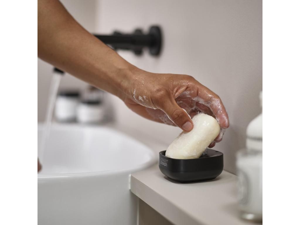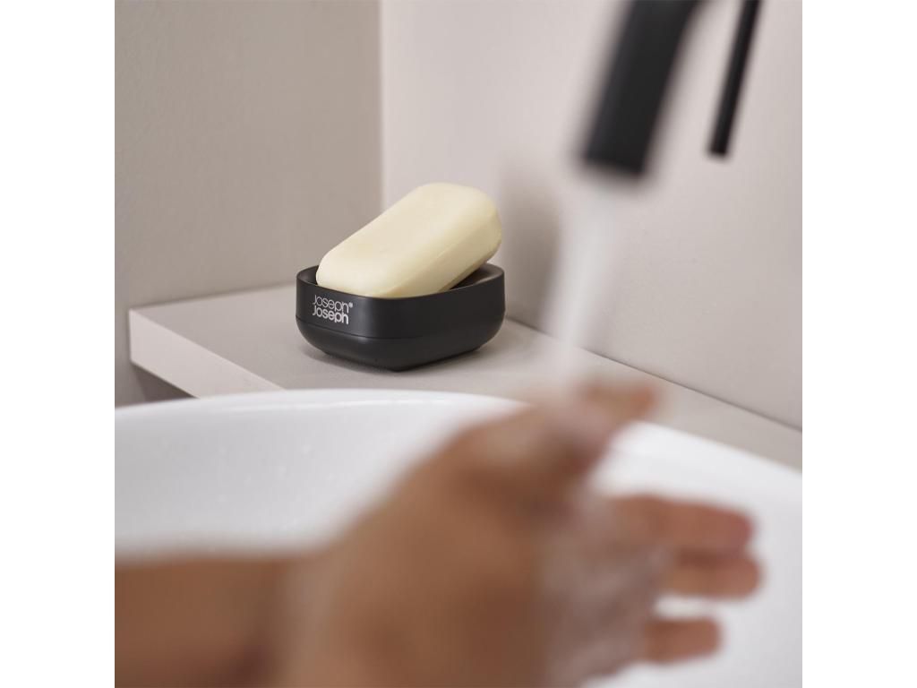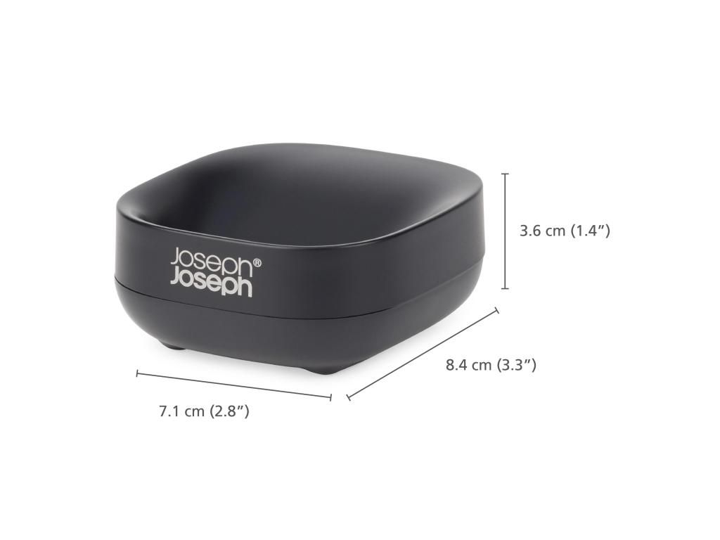- The compact Joseph Joseph SLIM soap dish is designed to take up minimal space at the sink while keeping the soap dry thanks to its thoughtful slanted design.