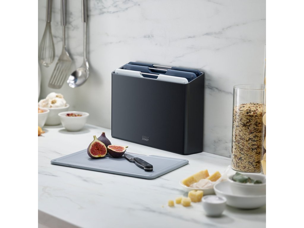 The strengths of plastic cutting boards are definitely their easy maintenance, hygiene and above all the fact that they are sensitive to our knives. The goal of the designers at Joseph Joseph this time was to provide cutting boards to hand on the countertop, to produce unique cutting boards to fulfill the purpose 100%, and also to solve their elegant storage. The Folio chopping board stand is a set for the most common kitchen chores.