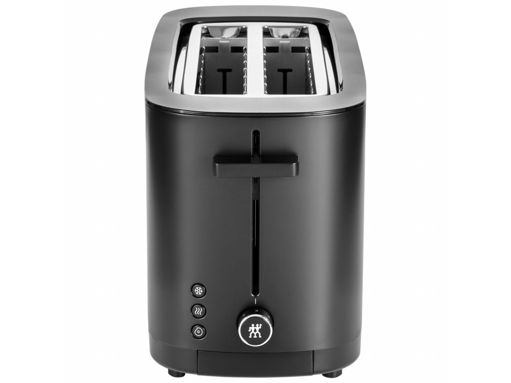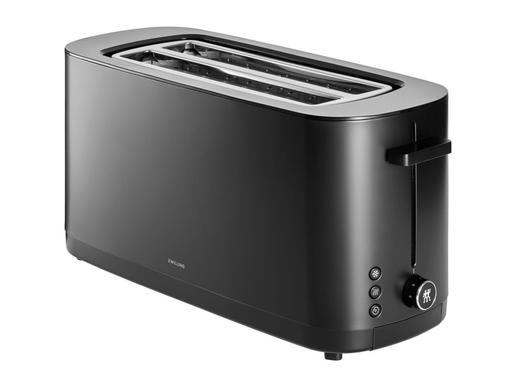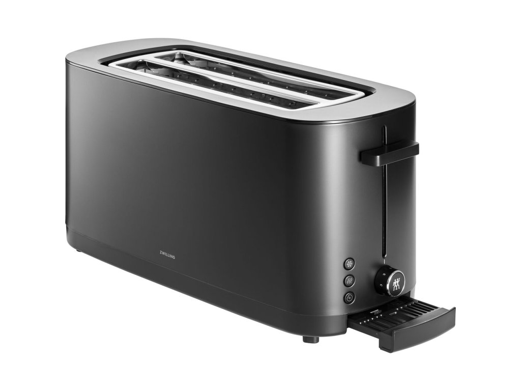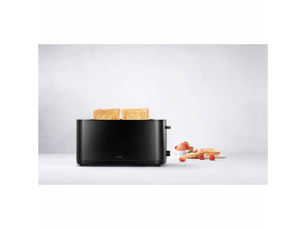 The Zwilling Enfinigy P4 toaster in black, elegant and timeless design prepares 4 toasts at a time. Thanks to the 4 separate heating elements in the toaster, it toasts evenly on all sides. The finished toast does not pop out of the toaster, but thanks to the soft-lift function, the toast slices are gently pushed upwards. The toaster automatically switches off after the set baking temperature has elapsed. Each toasting process can be interrupted immediately with the STOP button. The crumbs fall into a collection container which is simply removed and cleaned. The toaster oven has 7 baking levels and 3 automatic programs. Of course there is a defrosting or baking function.