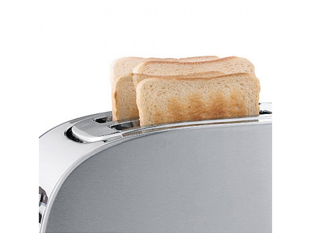 The STELIO toaster from the German brand WMF was made in a rounded design. Its elegant look combining brushed Cromargan® stainless steel with subtle black accessories fits perfectly into all kitchens. It is designed for toasting bread, toast up to a maximum size of 9 x 9 cm or other baked goods up to a width of 2.3 cm. A practical feature is the possibility to toast the bread from only one side.