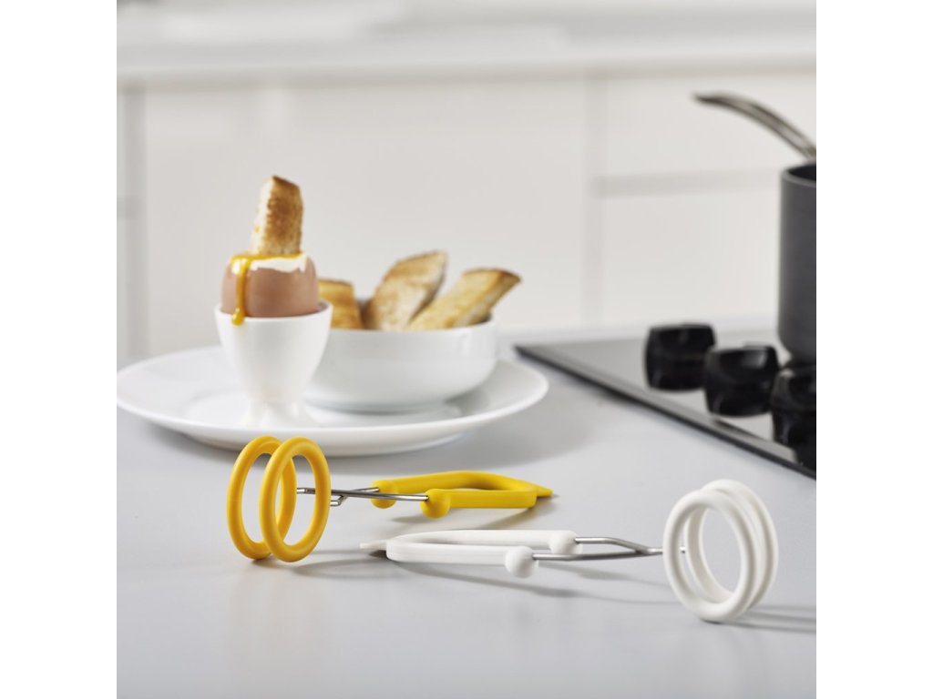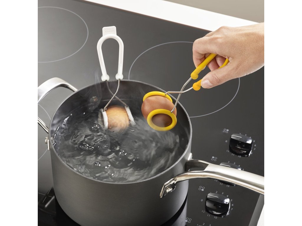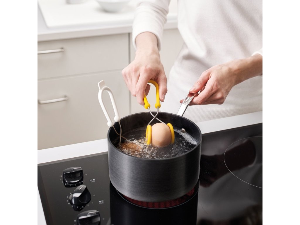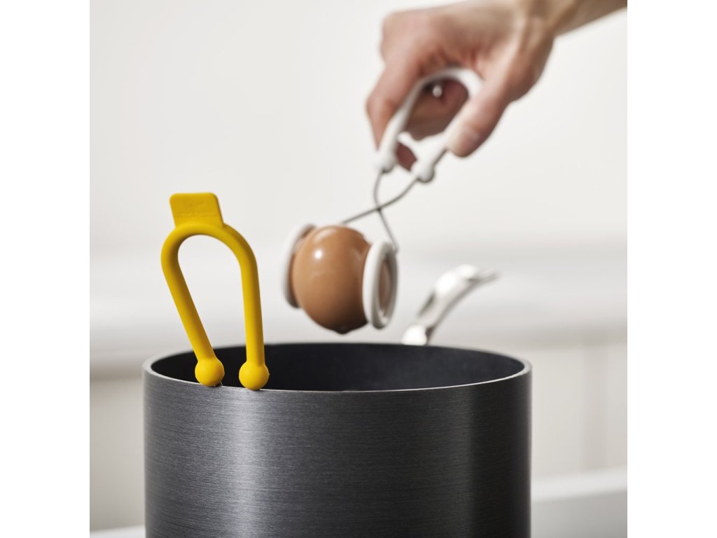 The JOSEPH JOSEPH O-Tongs help when cooking eggs. They make it easier to handle the egg when inserting and removing it from the pot. Their silicone handles can withstand temperatures up to 270 °C. When cooking, you can leave the egg clamped in the tongs that you hang over the edge of the pot. By preventing the eggs from moving around in the pot, you reduce the risk of them breaking. The tongs are supplied in pairs, in white and yellow. The colour resolution helps to select different cooking times.