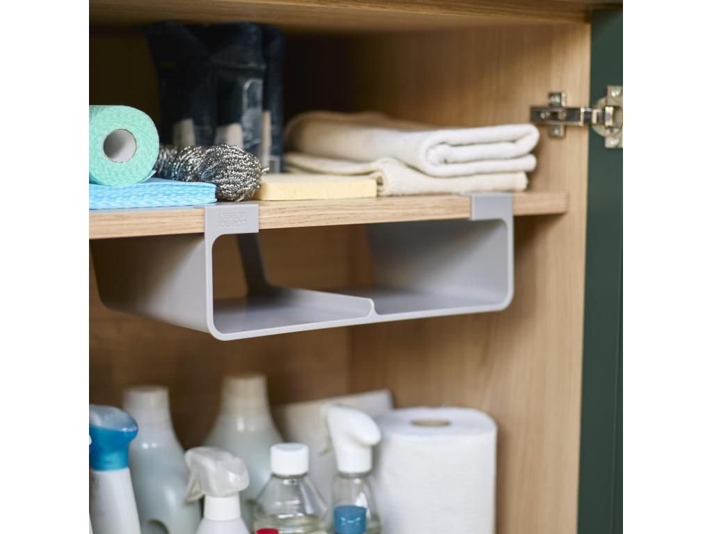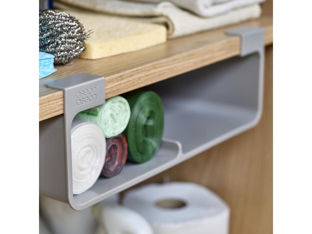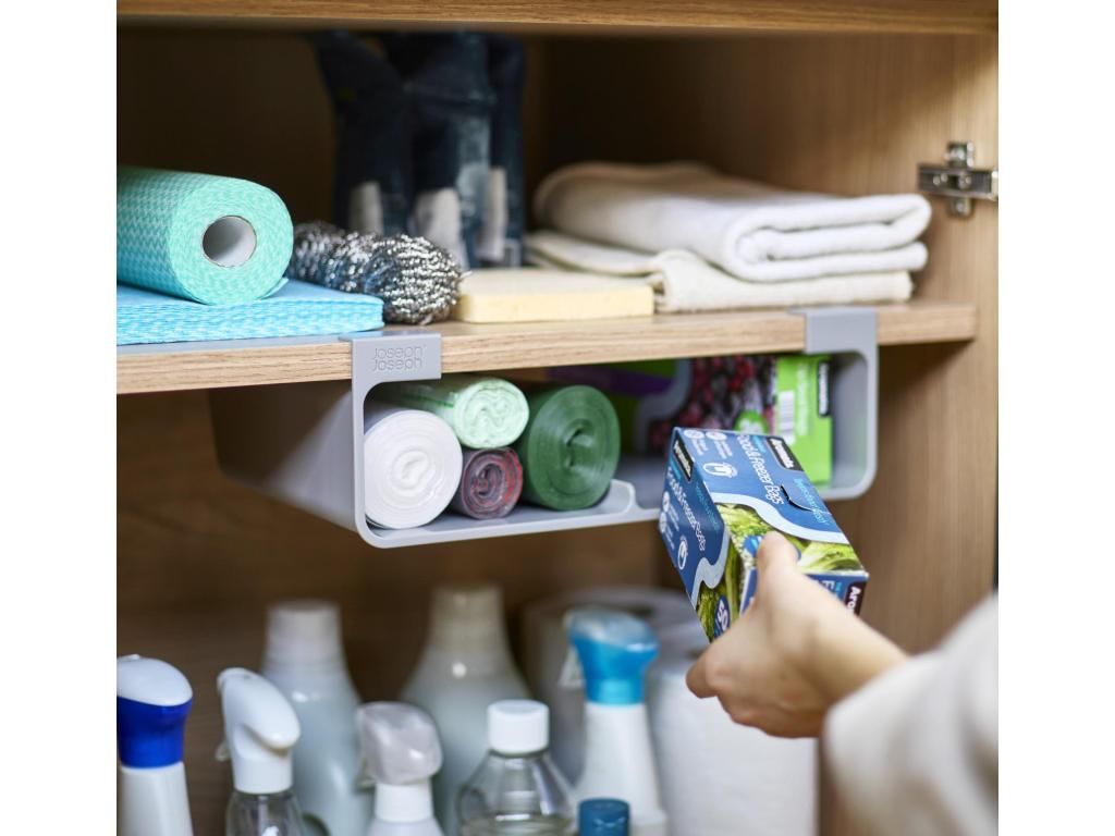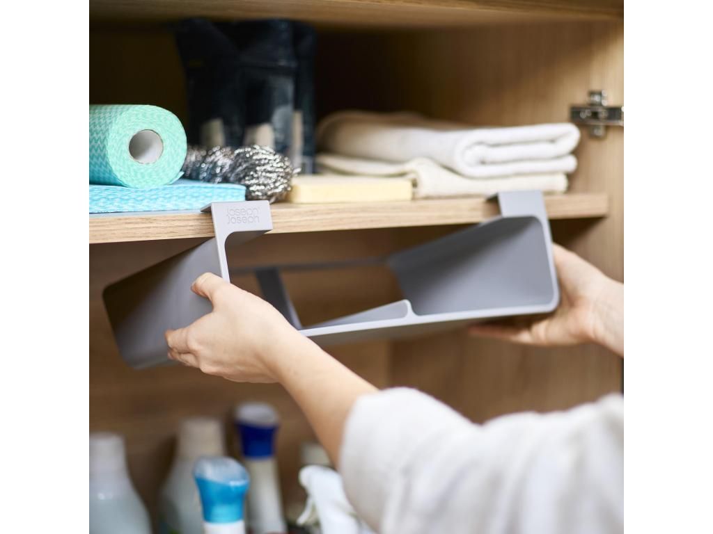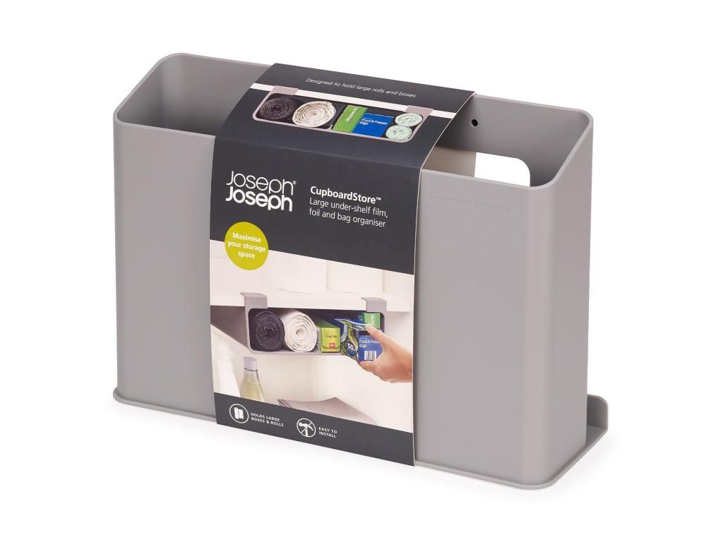 - The Joseph Joseph CUPBOARDSTORE organizer allows you to use the free space under the shelf of a kitchen cabinet and creates a practical place for storing kitchen foil, aluminum foil or bags.