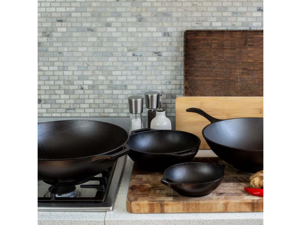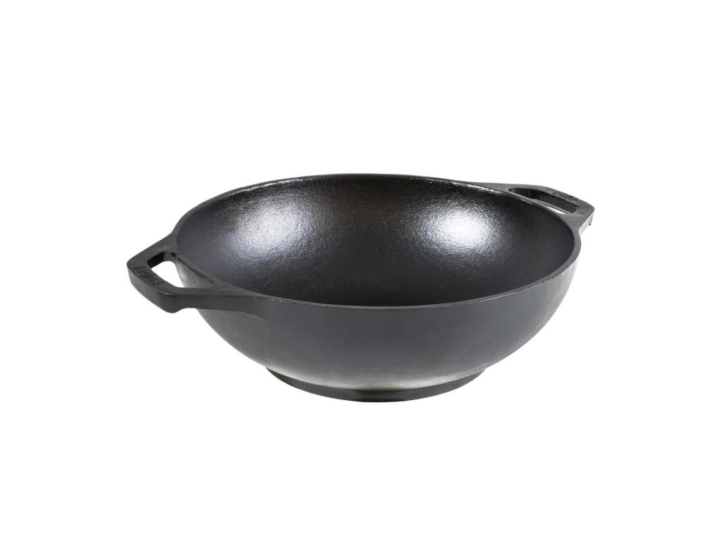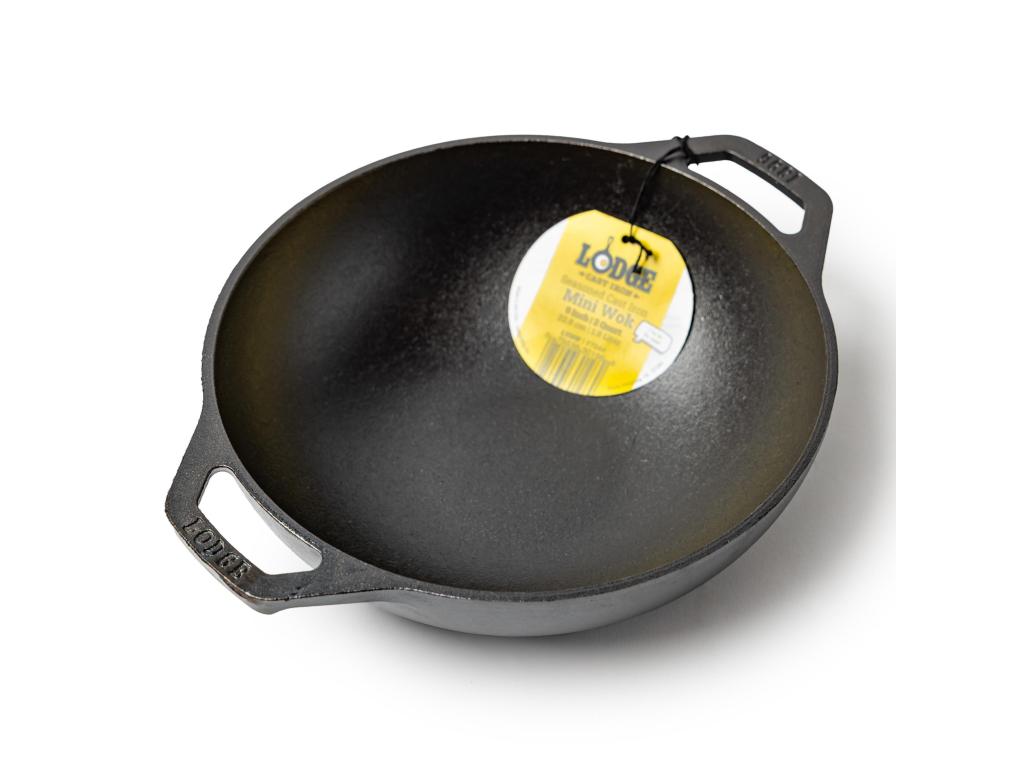 - The compact cast iron wok Lodge with a diameter of 23 cm is an ideal choice for preparing and serving smaller portions of dishes by sautéing, frying, stewing or baking.