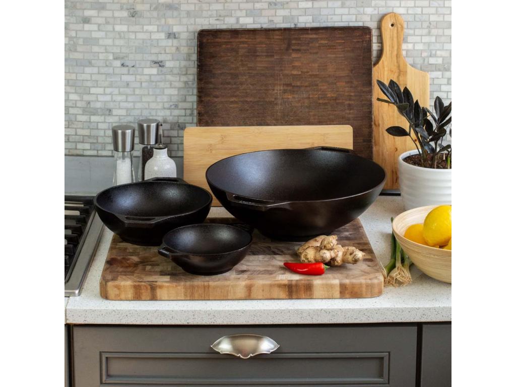 - The cast iron wok Lodge with a diameter of 35 cm is an ideal choice for preparing larger portions of food by sautéing, frying, stewing or baking.